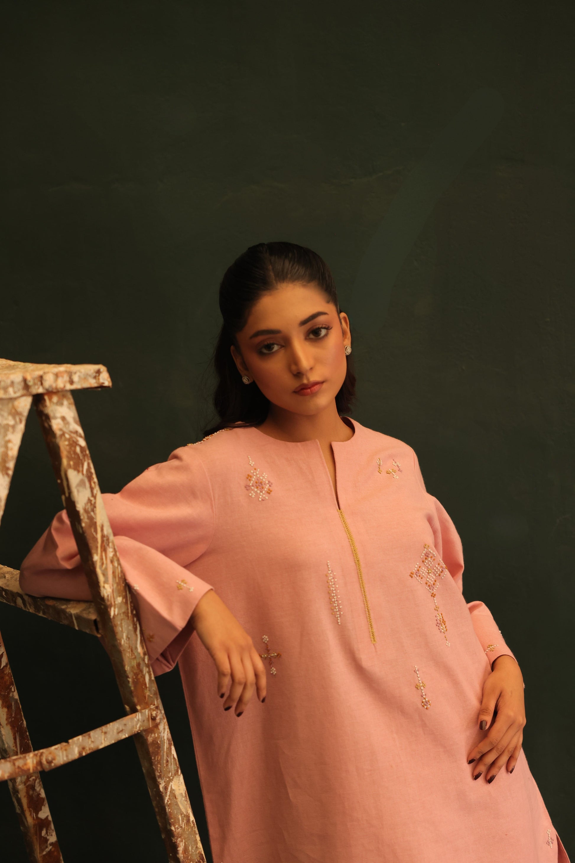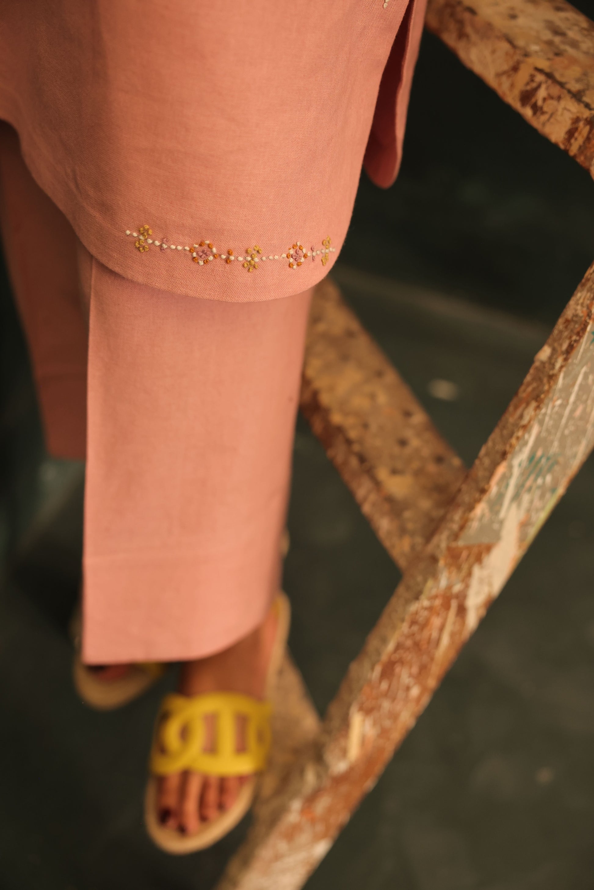A soft winter linen set in a muted blush tone, finished with delicate hand embroidery that adds quiet detail without distraction. The silhouette is relaxed, refined, and designed for ease.