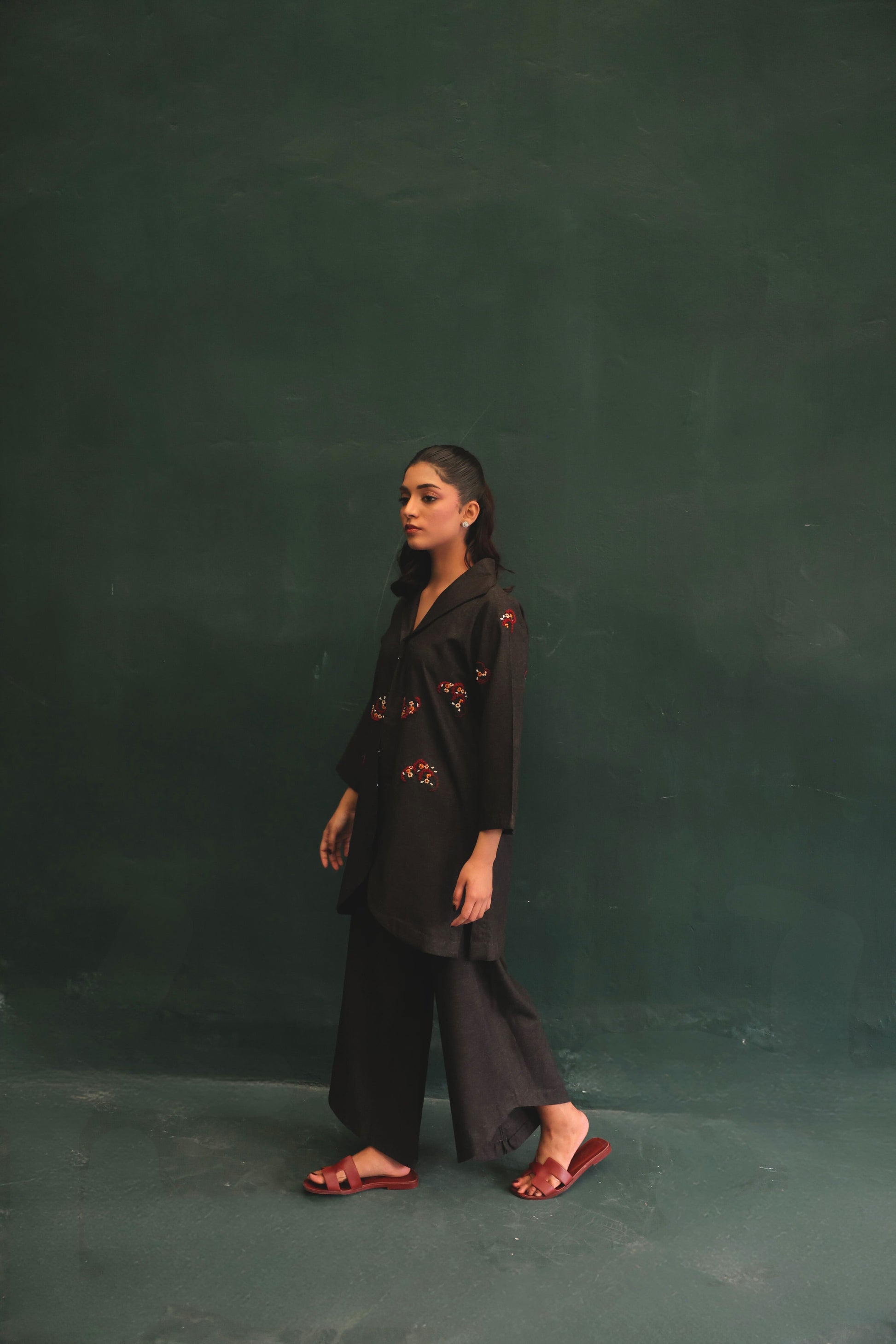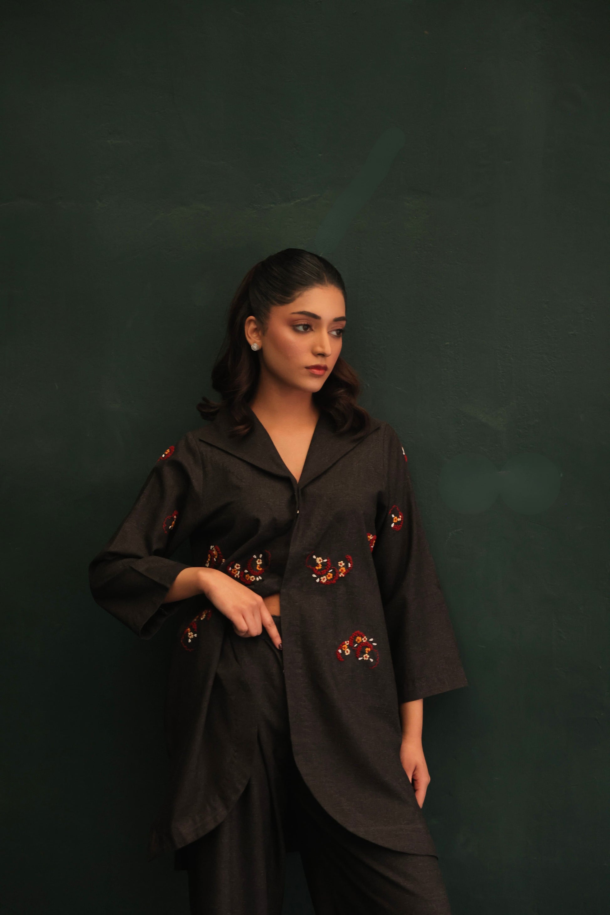 A tailored winter set in deep charcoal textured blend fabric, accented with scattered hand embroidery in warm red and ivory tones. The structured shirt features a soft lapel neckline and a relaxed, fluid fall, paired with easy wide-leg trousers.