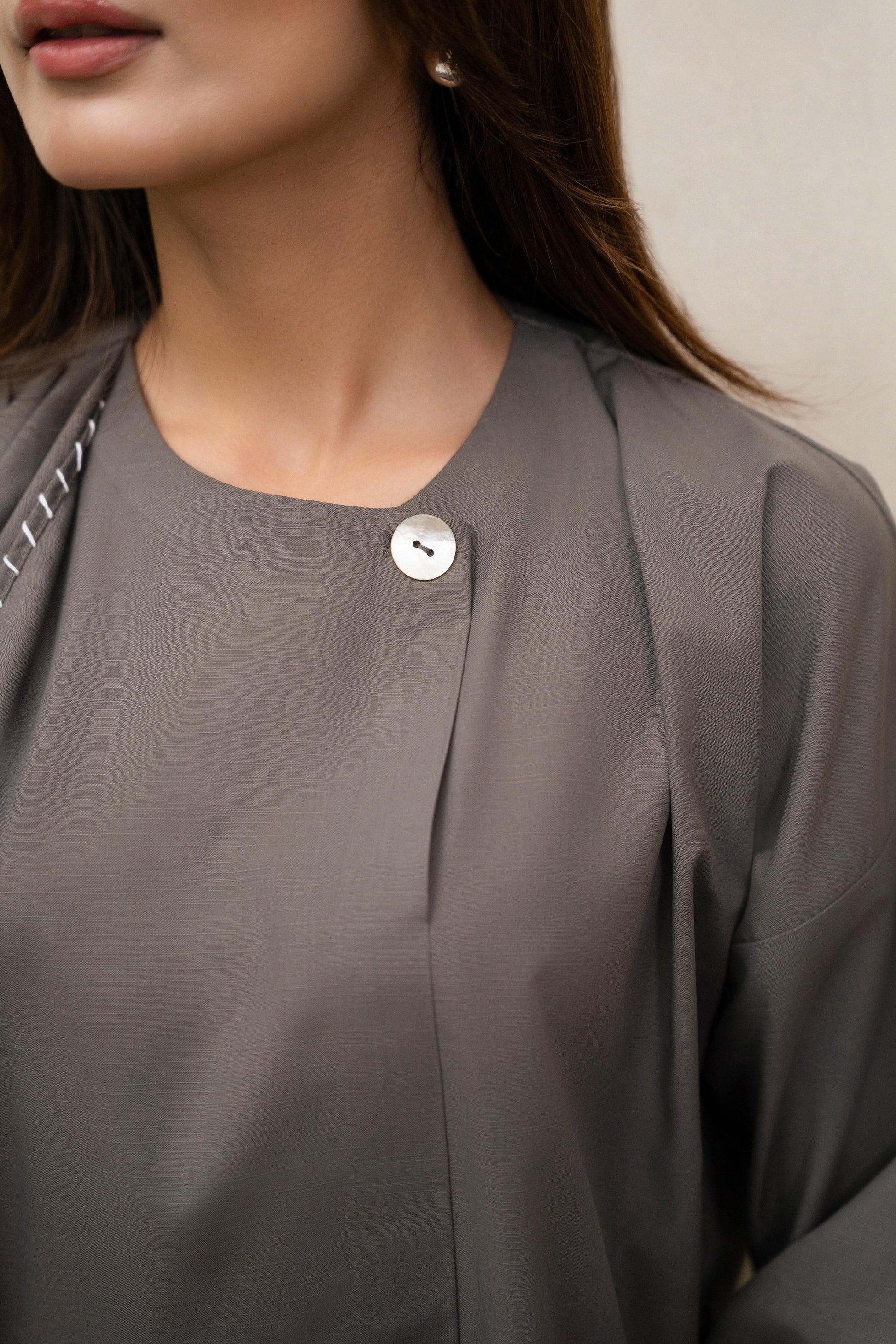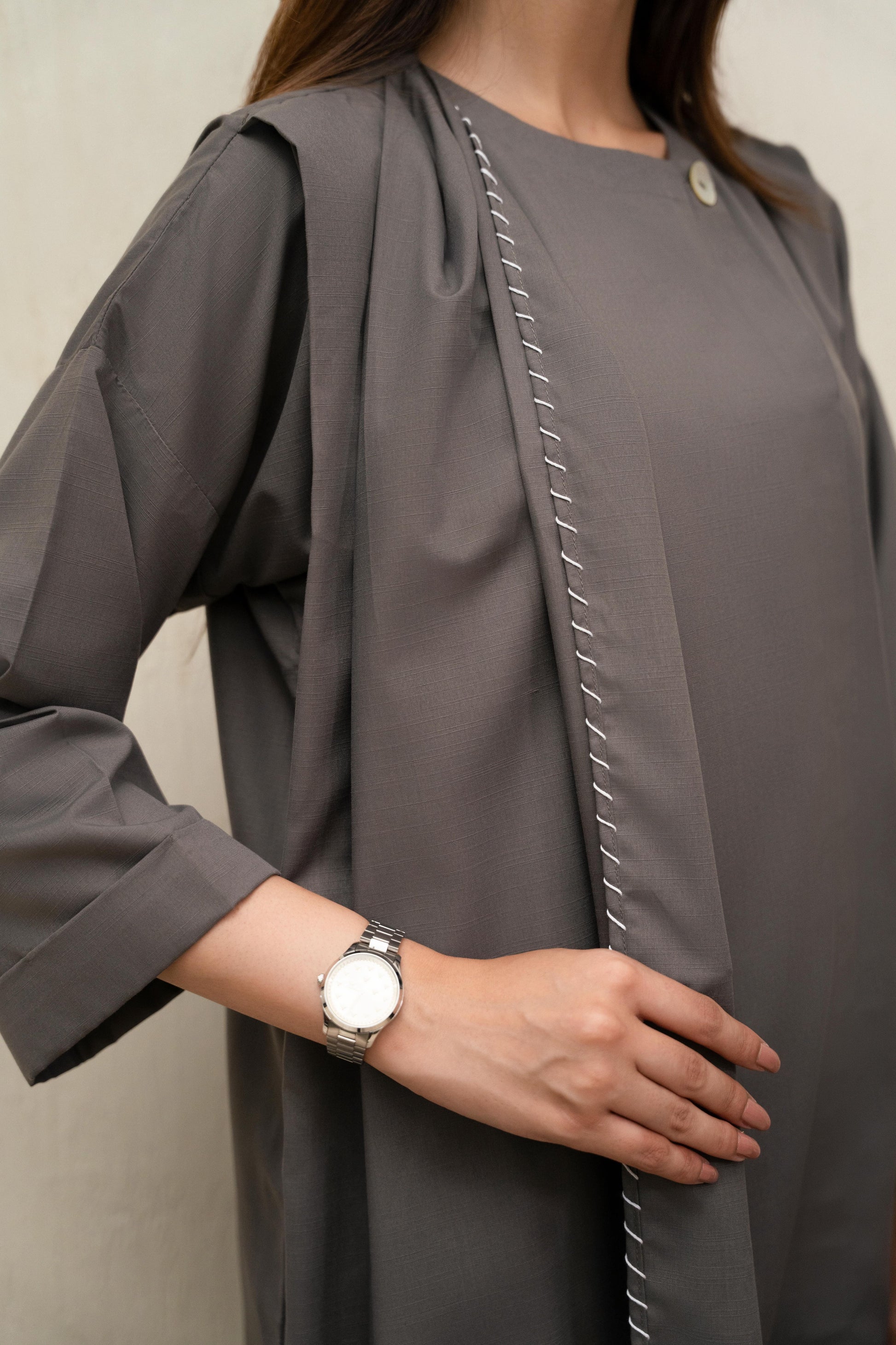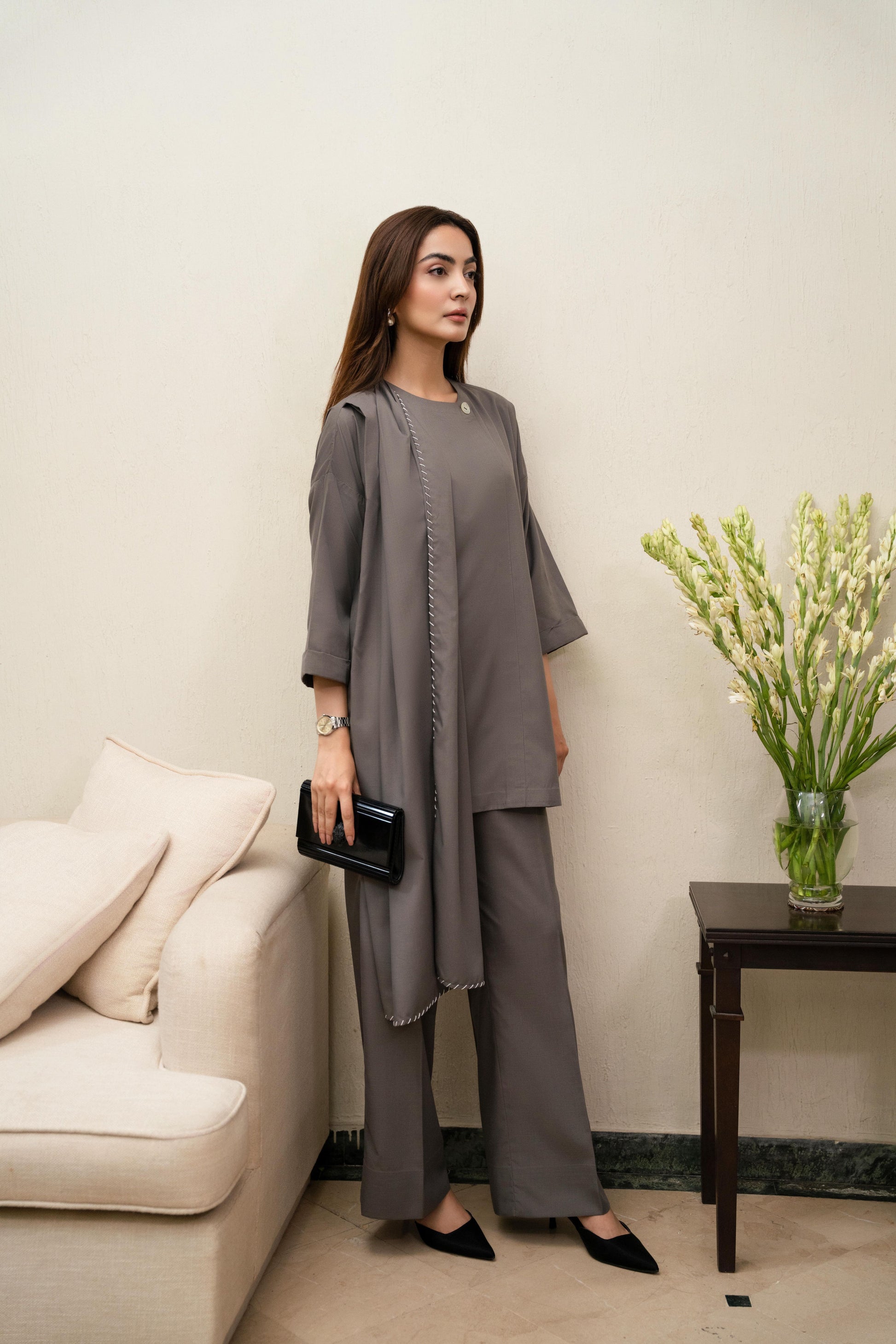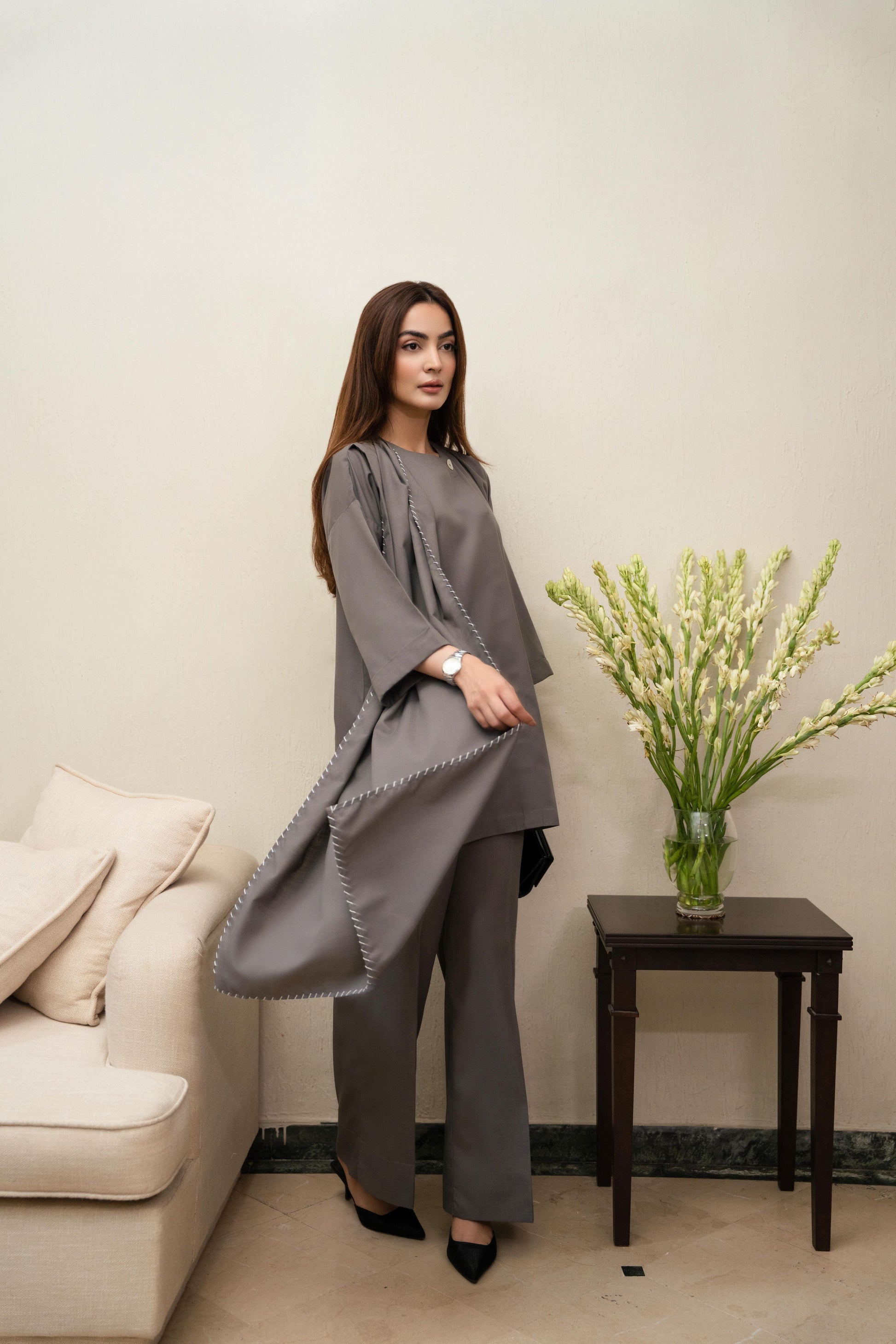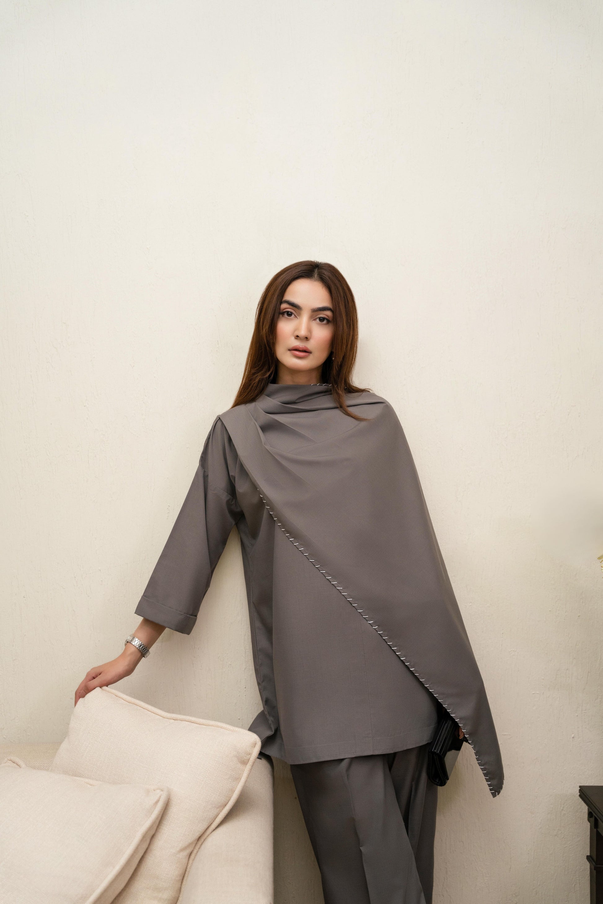 Cut from a textured poly blend, this grey co-ord brings structure with ease. The short shirt is designed with a built-in scarf detail, finished with hand-done stitches that give it subtle craft. Paired with straight long trousers, it’s minimal yet striking, a modern solid with quiet elegance.