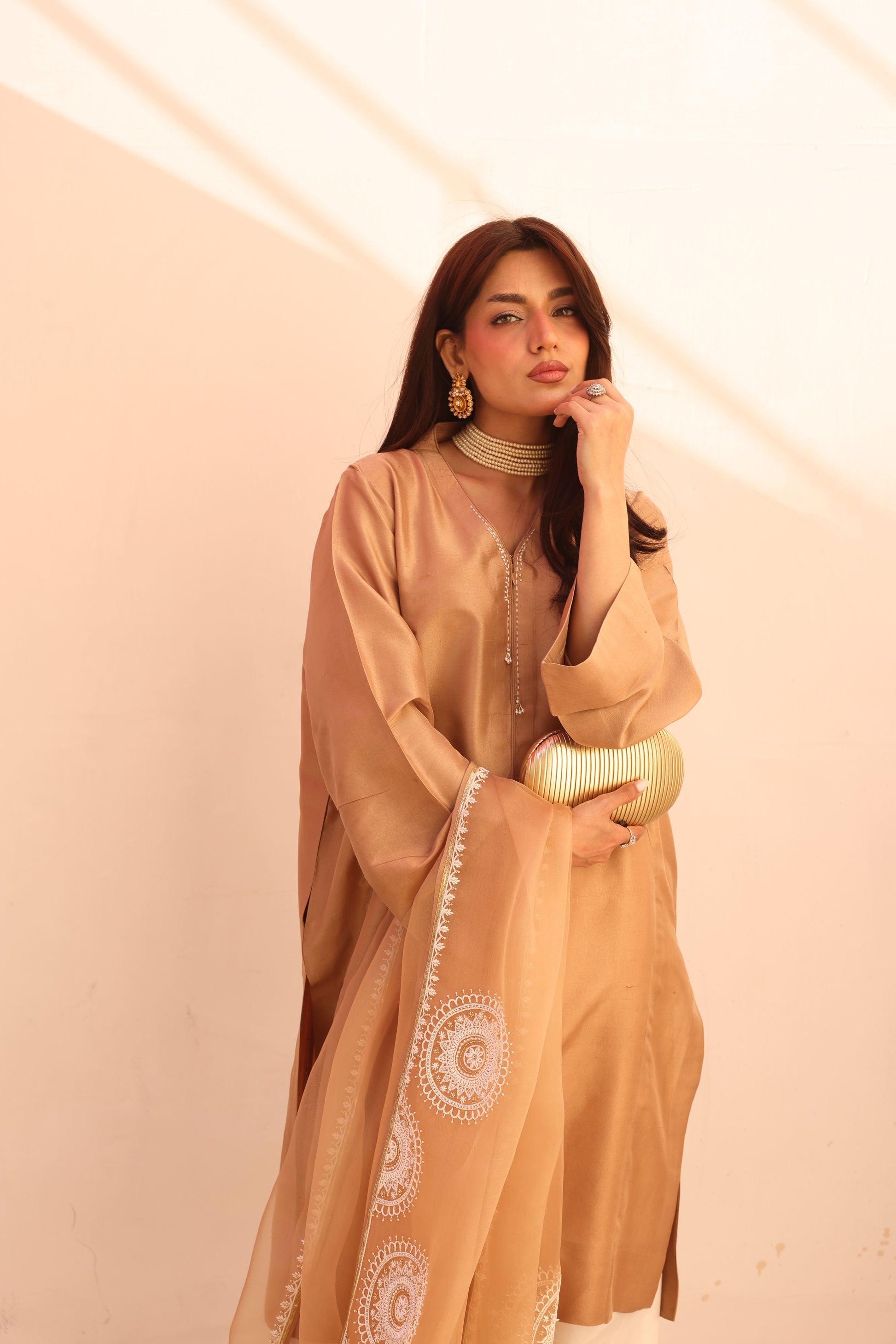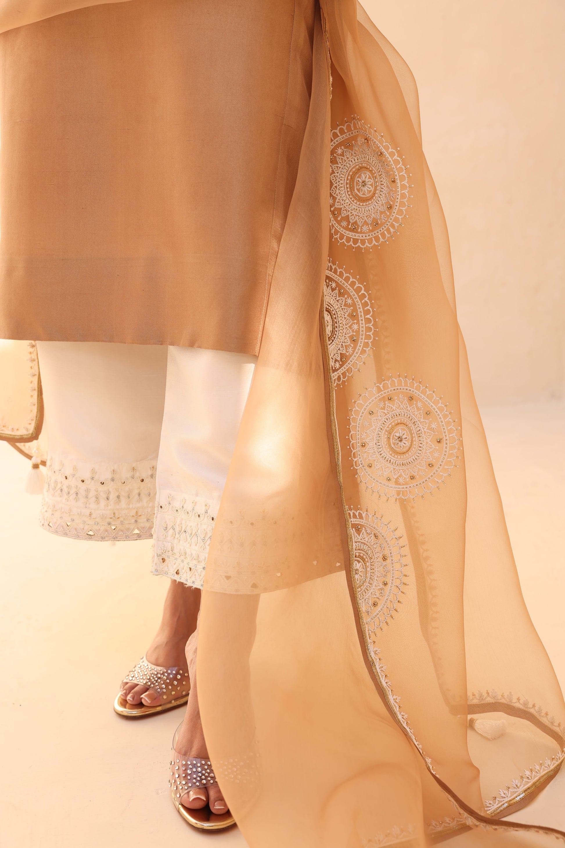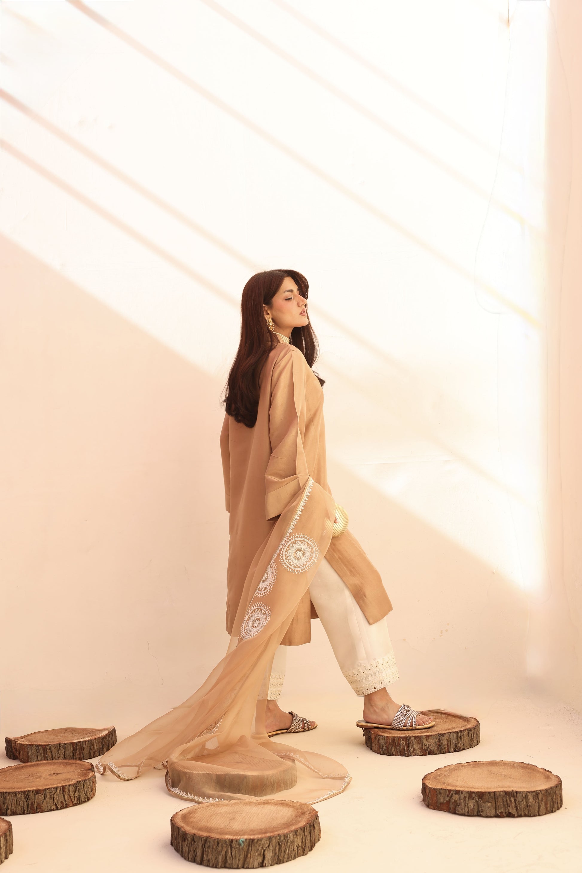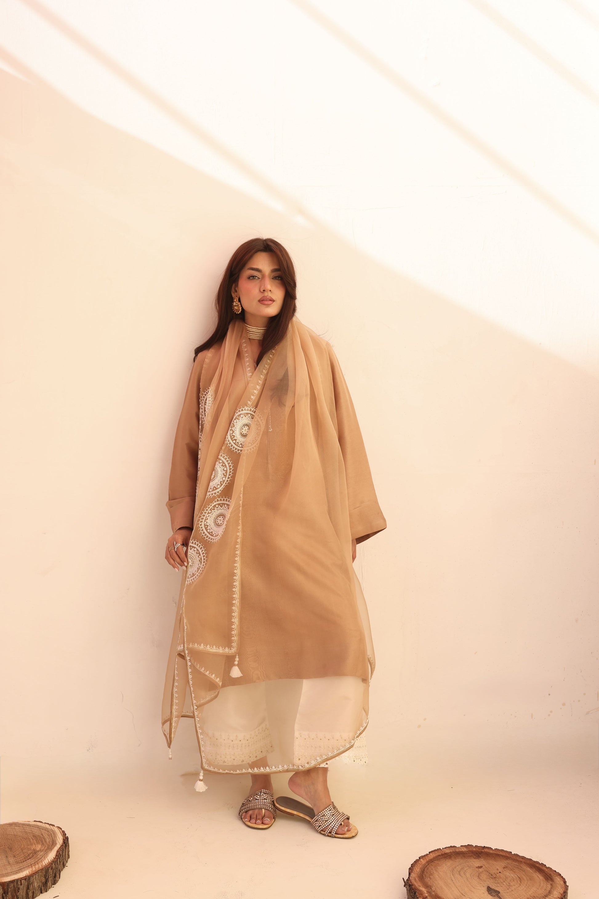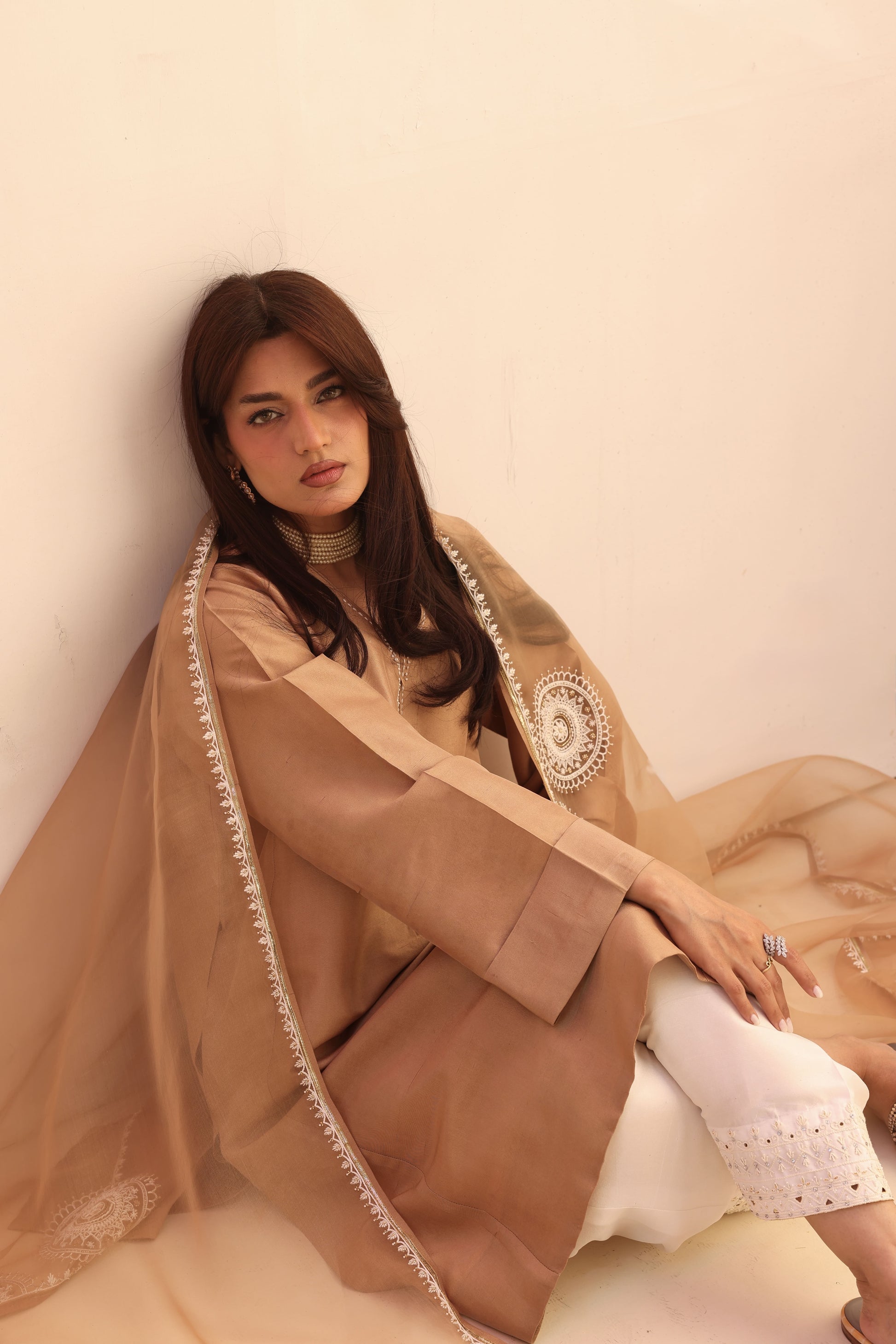 Rimal is warm like late afternoon light; soft, golden, and quietly luminous. The camel-toned kurta keeps things clean and fluid, while the sheer dupatta steals the moment with intricate mandala embroideries that trail gently along its edge.