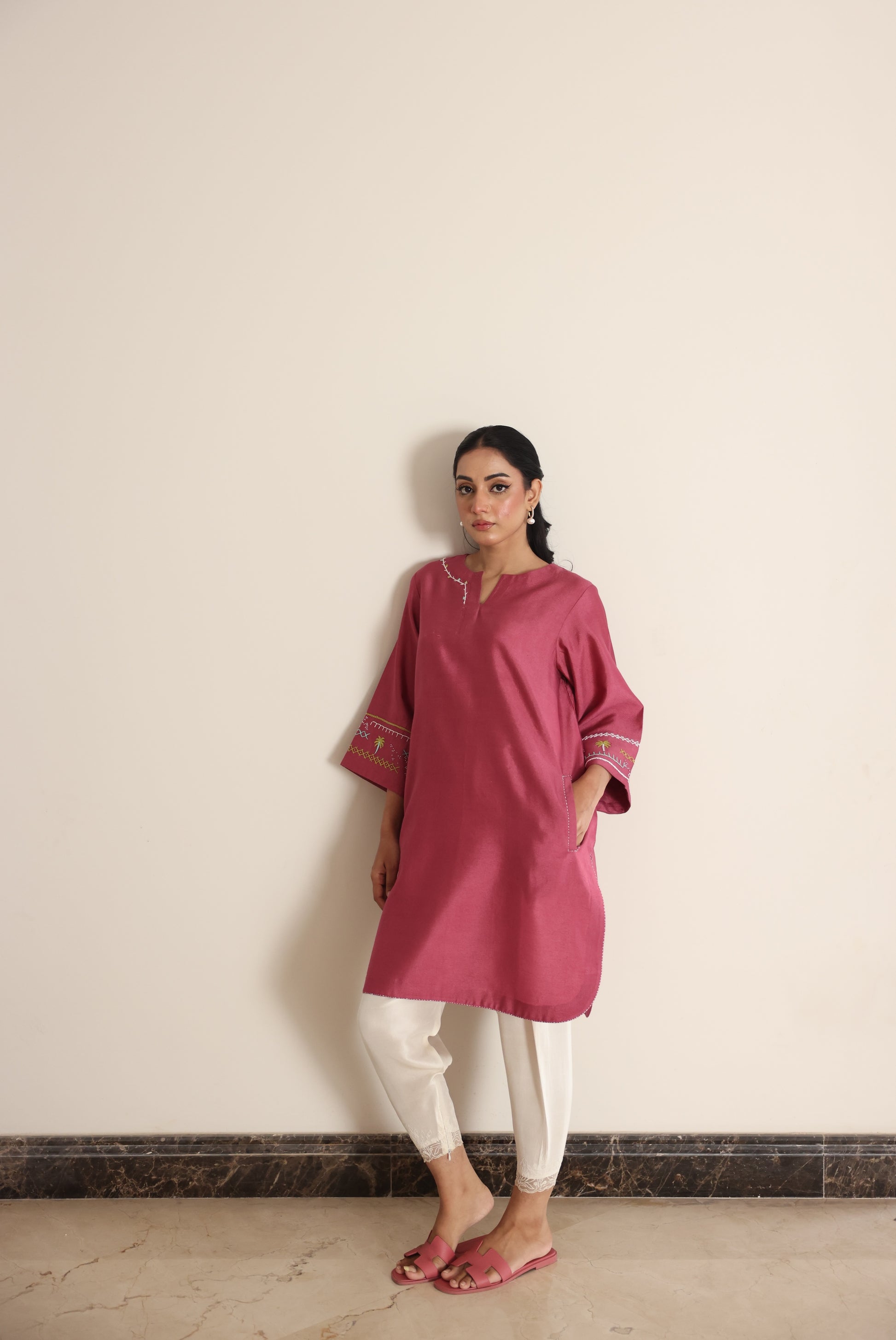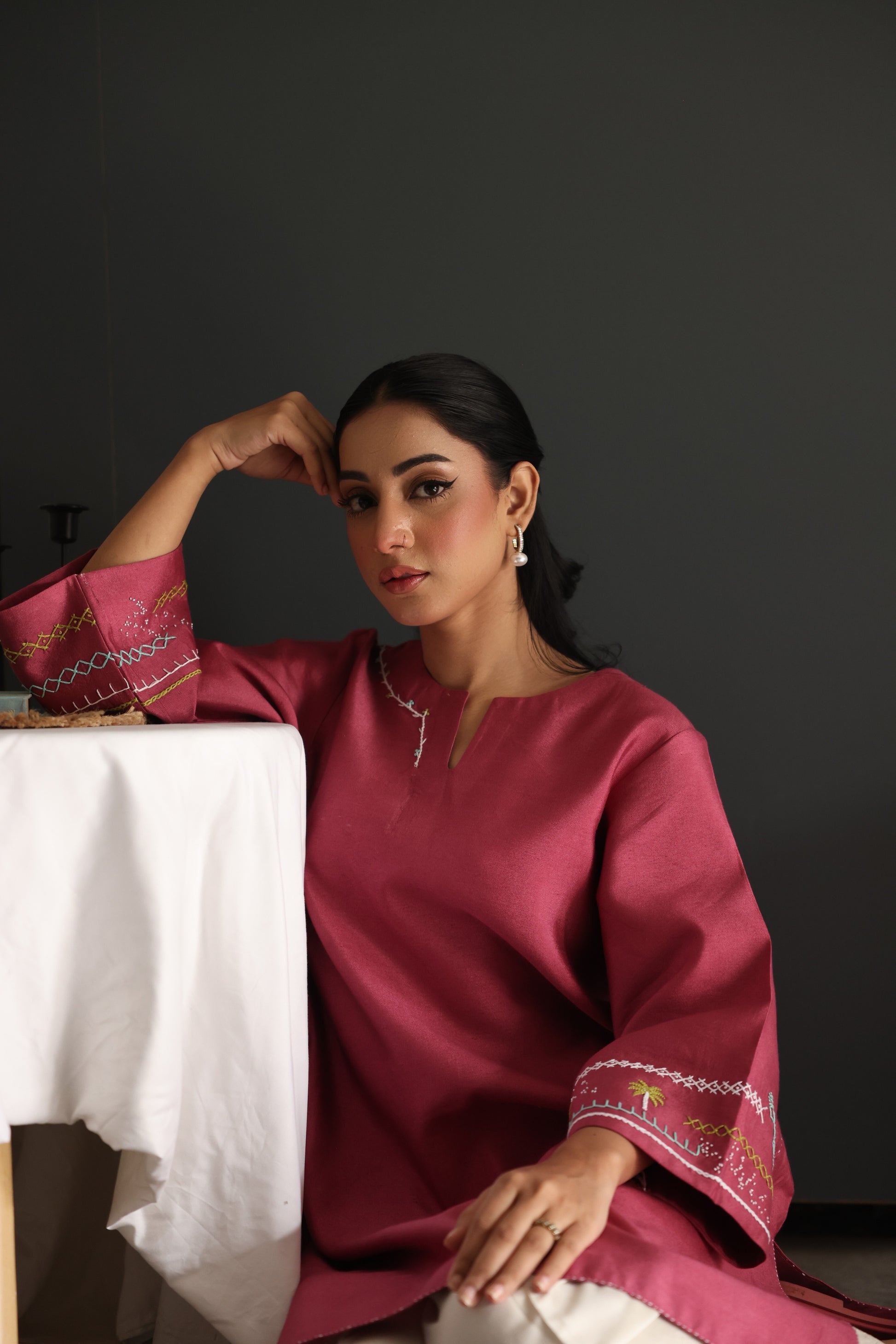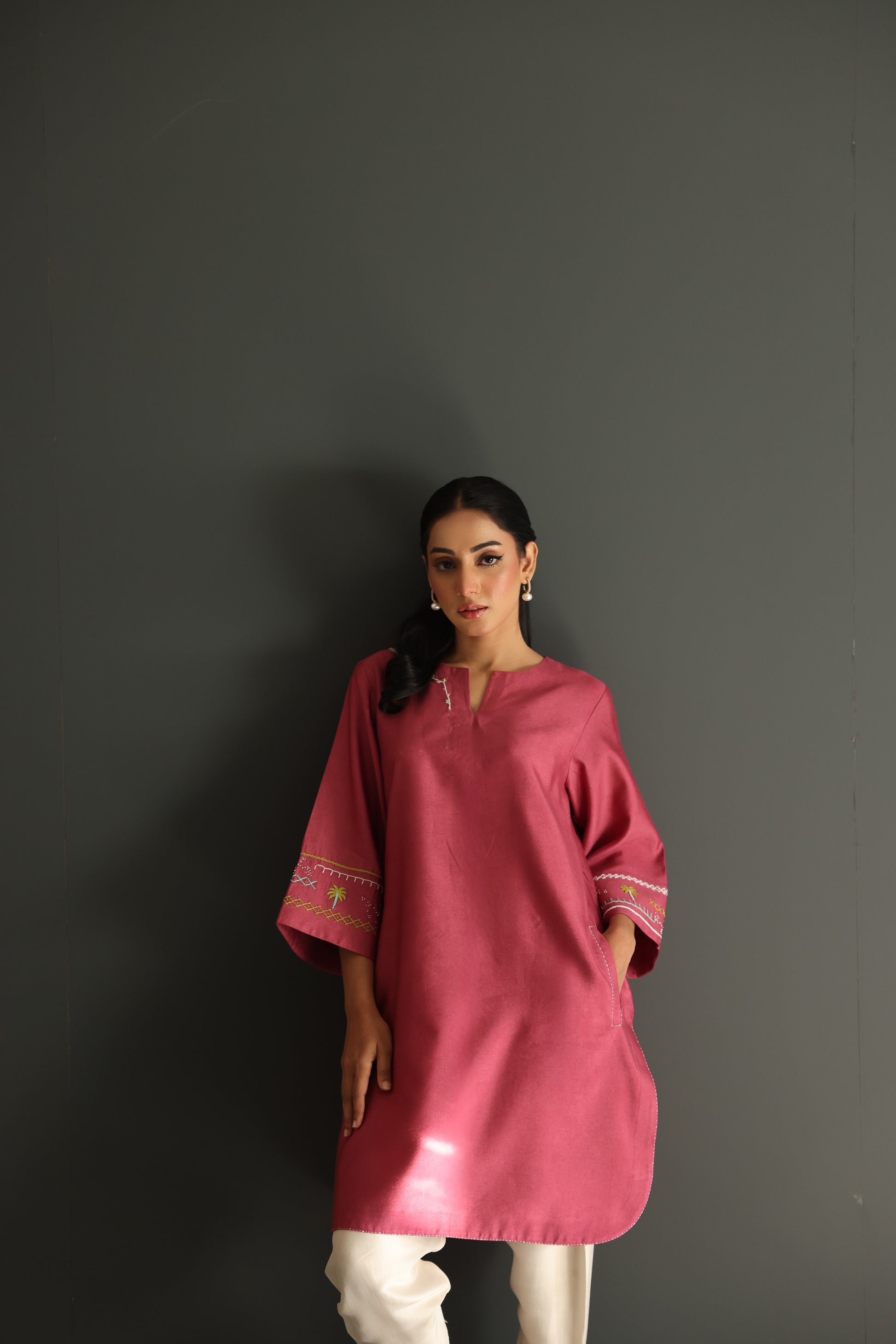 Easy, breezy and effortlessly cool, the pink Rina set in bubblegum pink, is the transitional outfit of the season. Featuring carefully done hand embroideries with multiple stitches is completed with a round hem and tassels. Practical pockets add a touch of ease.