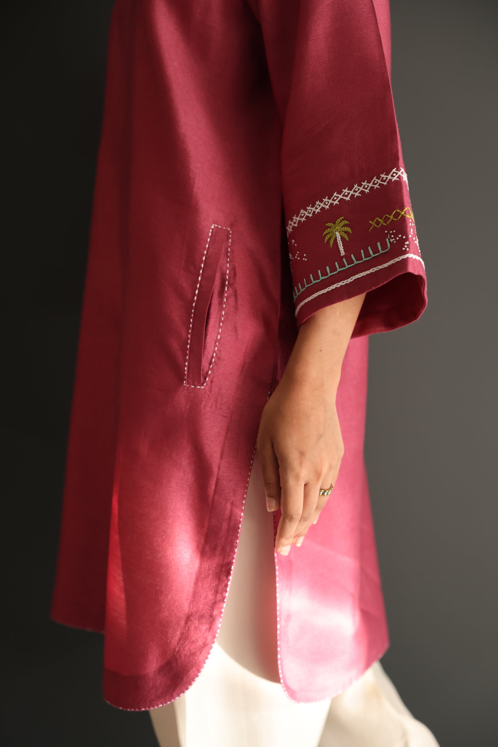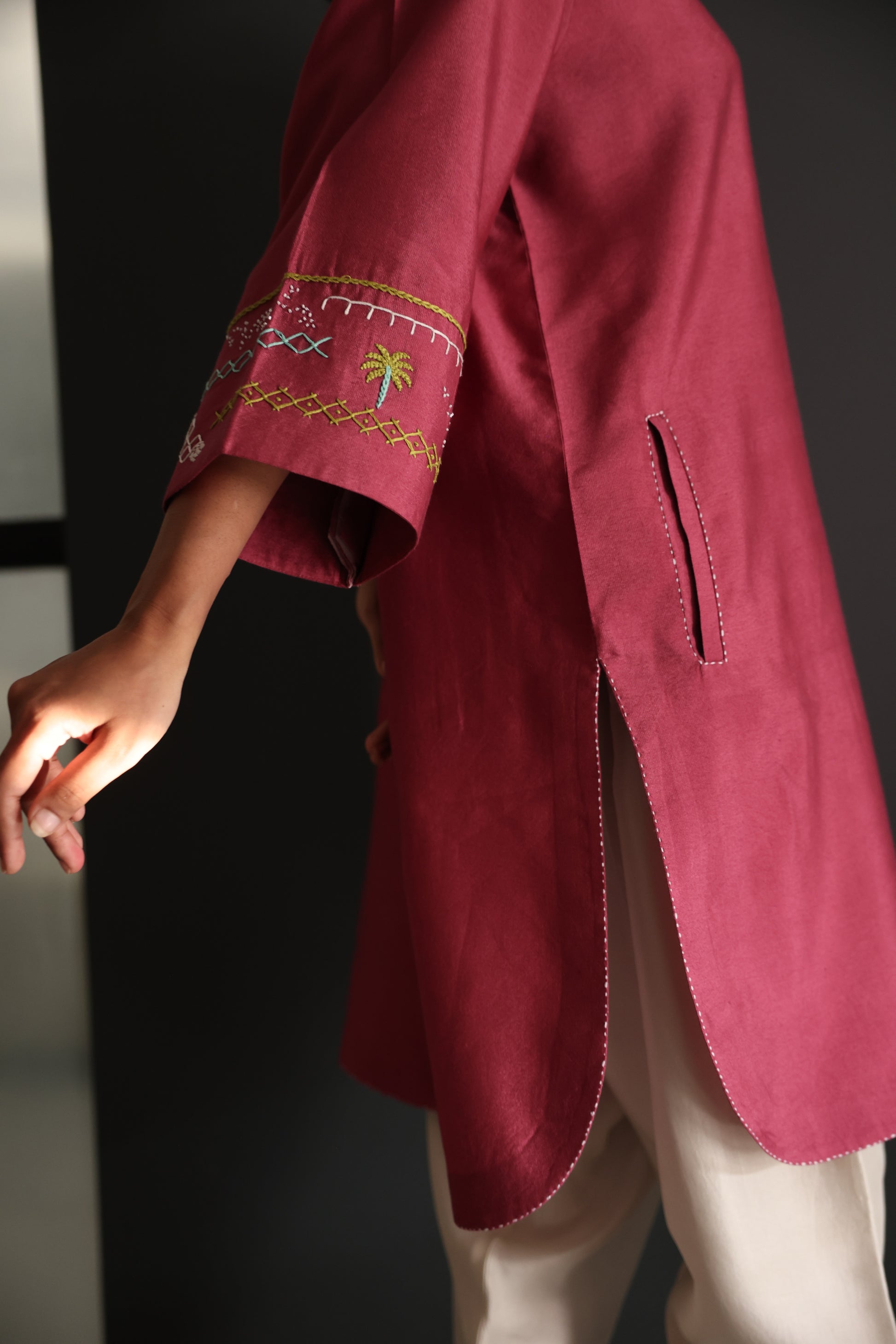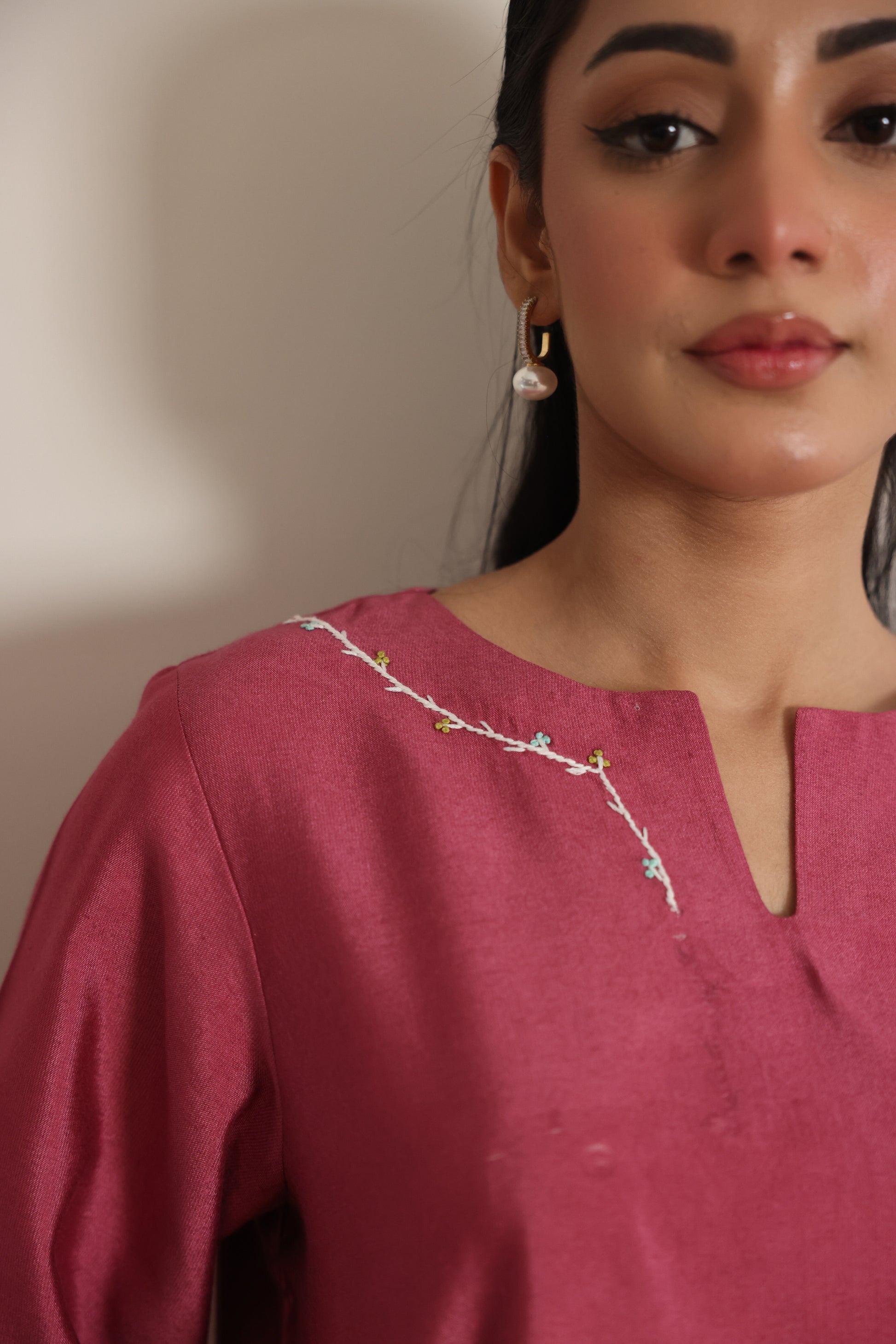 Easy, breezy and effortlessly cool, the pink Rina set in bubblegum pink, is the transitional outfit of the season. Featuring carefully done hand embroideries with multiple stitches is completed with a round hem and tassels. Practical pockets add a touch of ease.