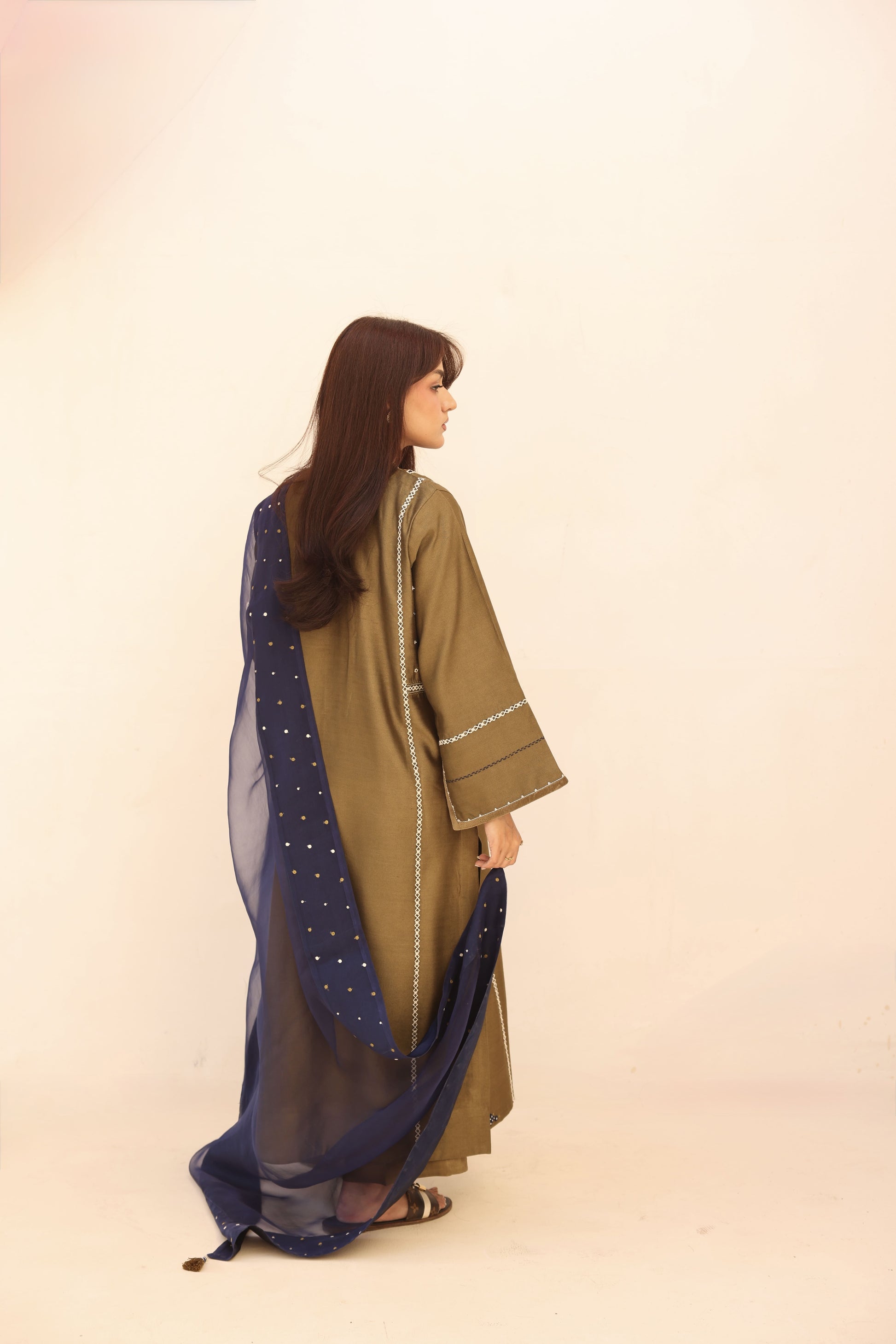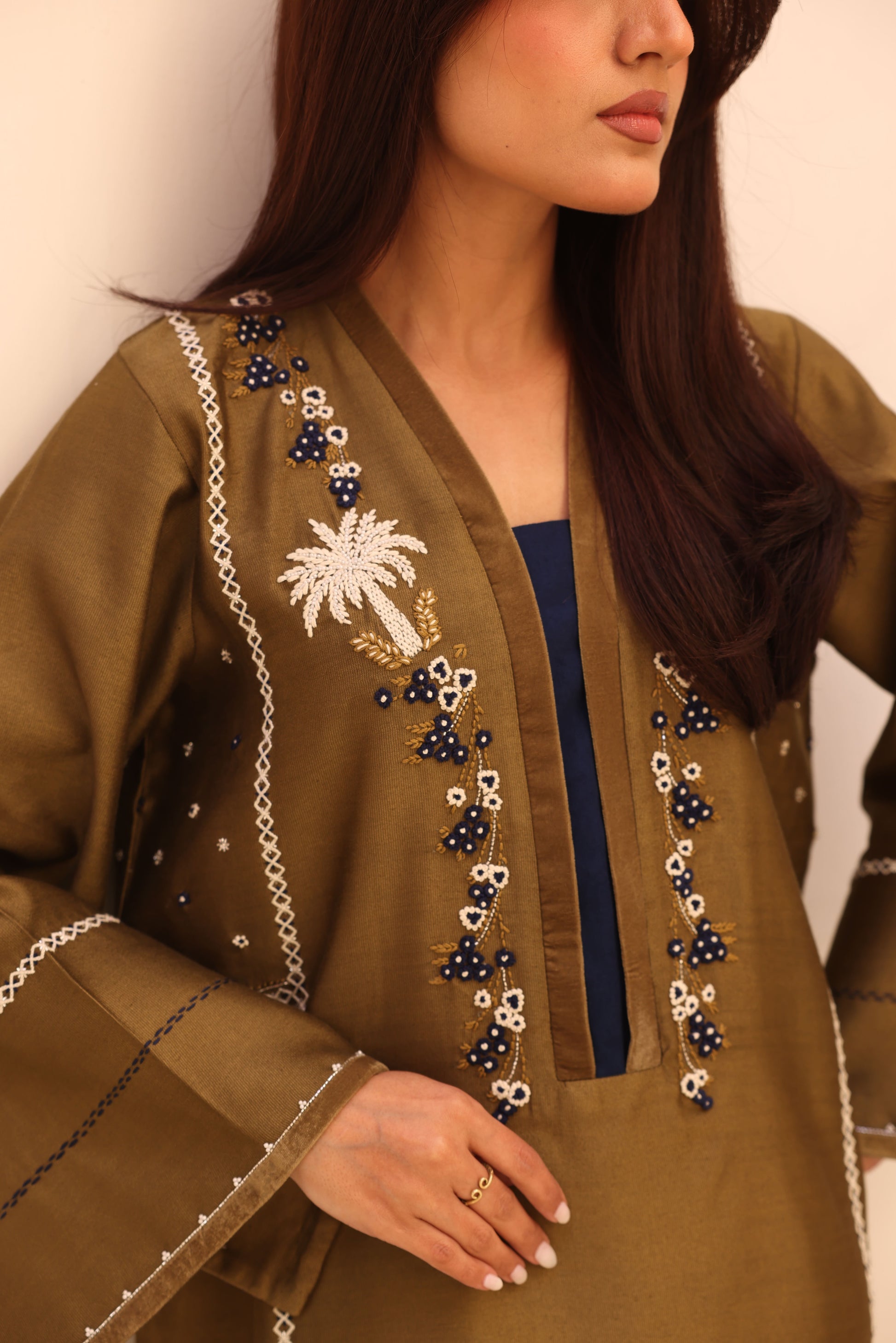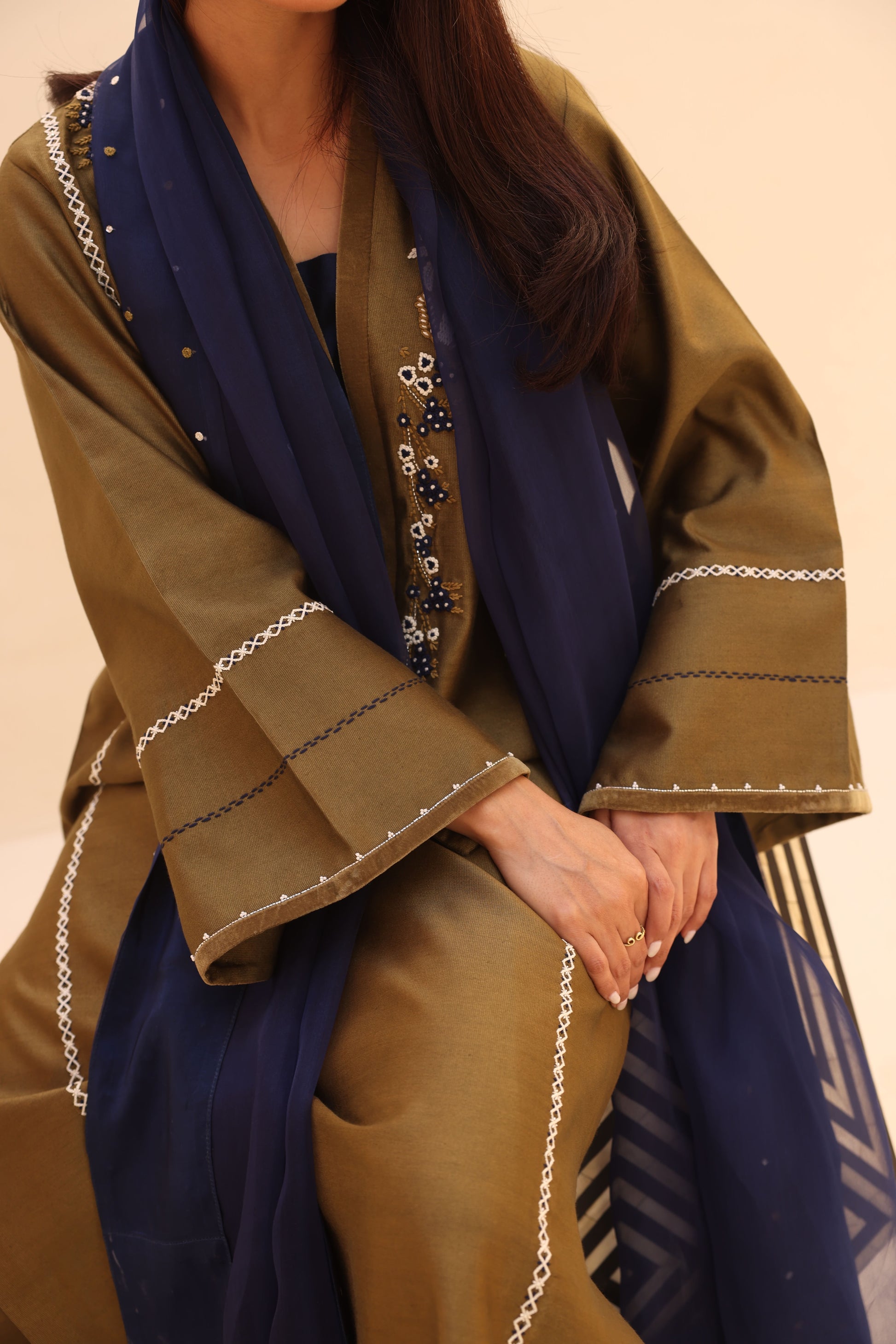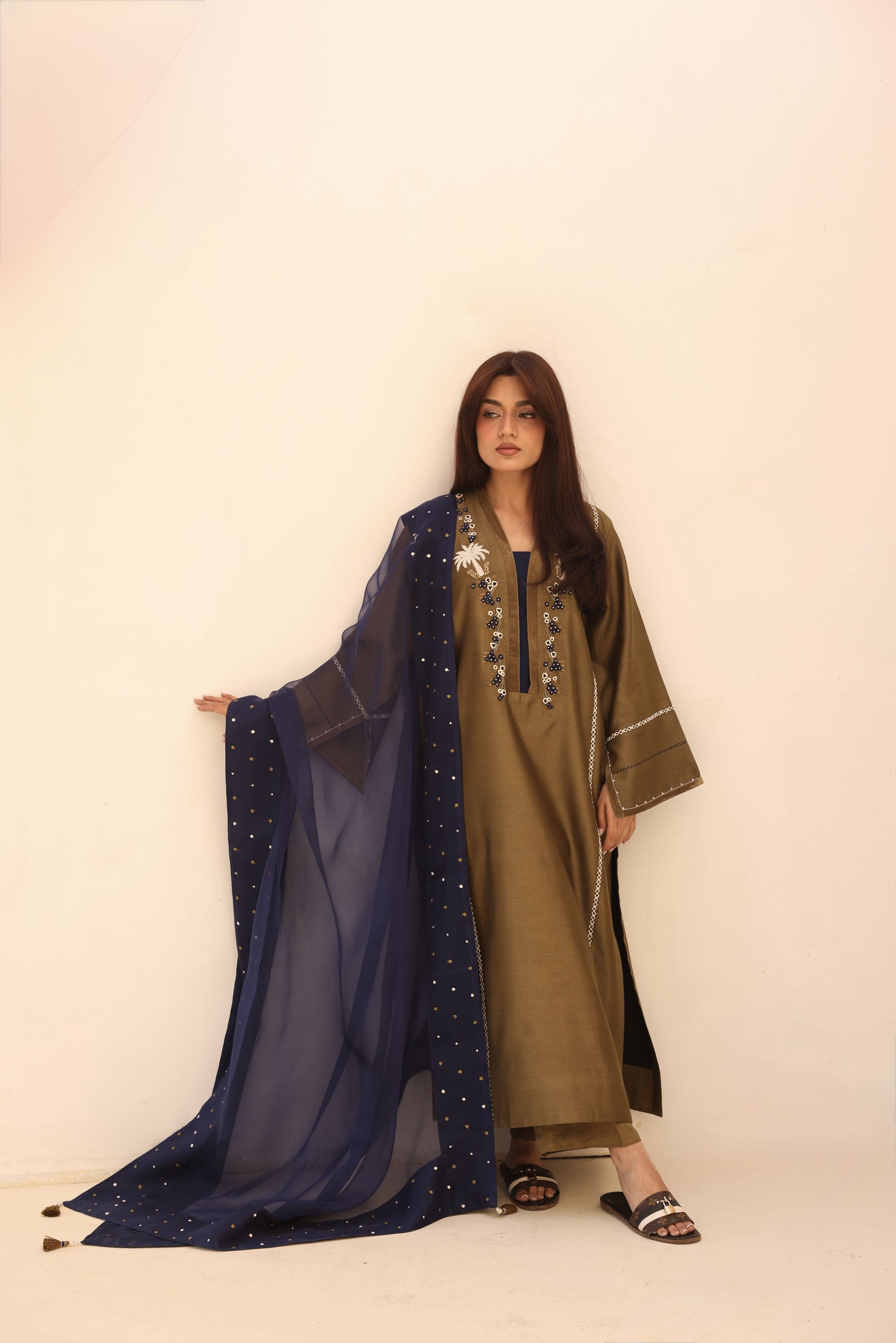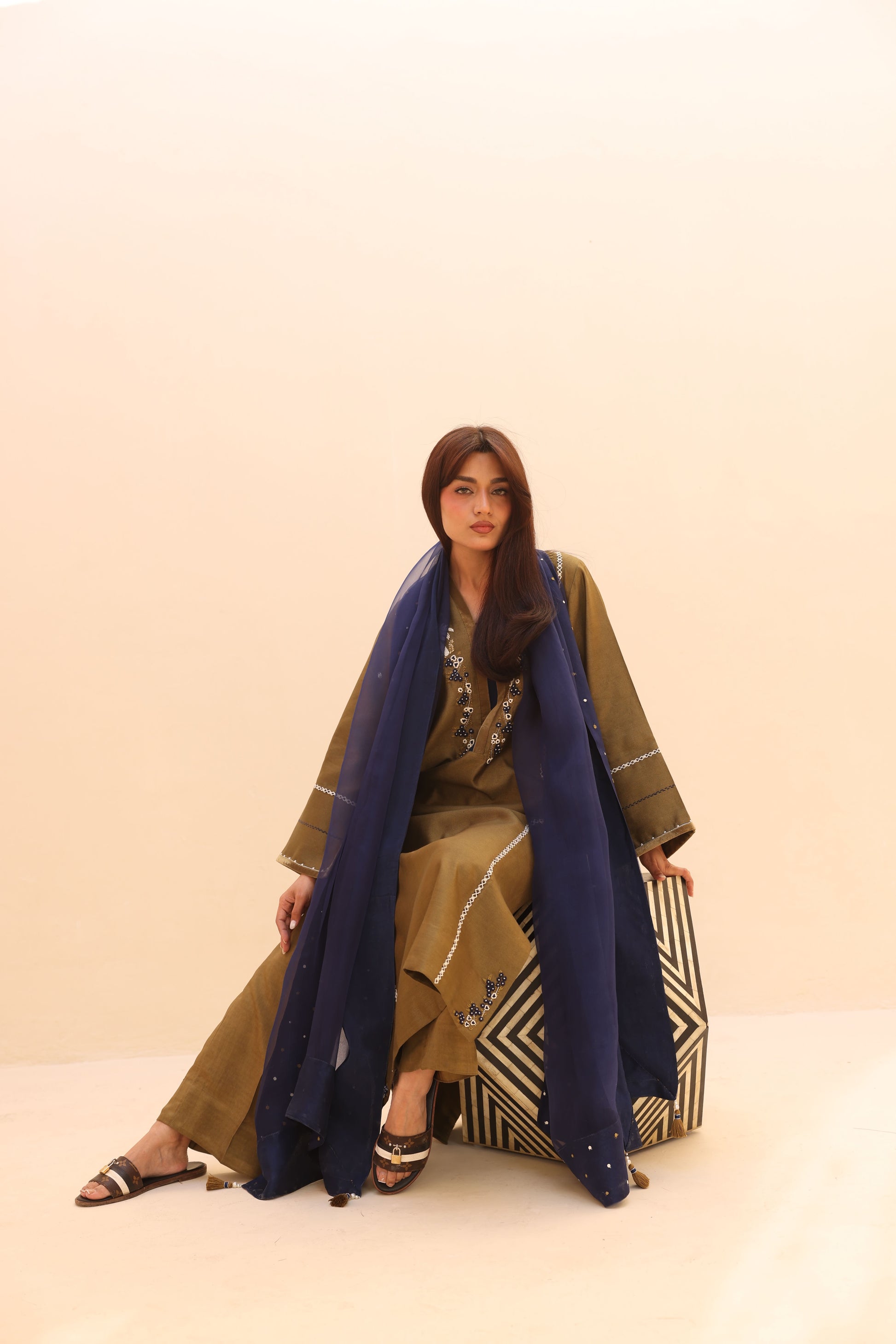 Sable is where earthy olive meets deep midnight blue, a pairing that feels rich, calm, and quietly bold. The kurta is traced with delicate hand embroidery that runs like soft lines of poetry across the fabric, while the navy dupatta drapes fluidly, dotted with subtle accents that catch the light as you move.