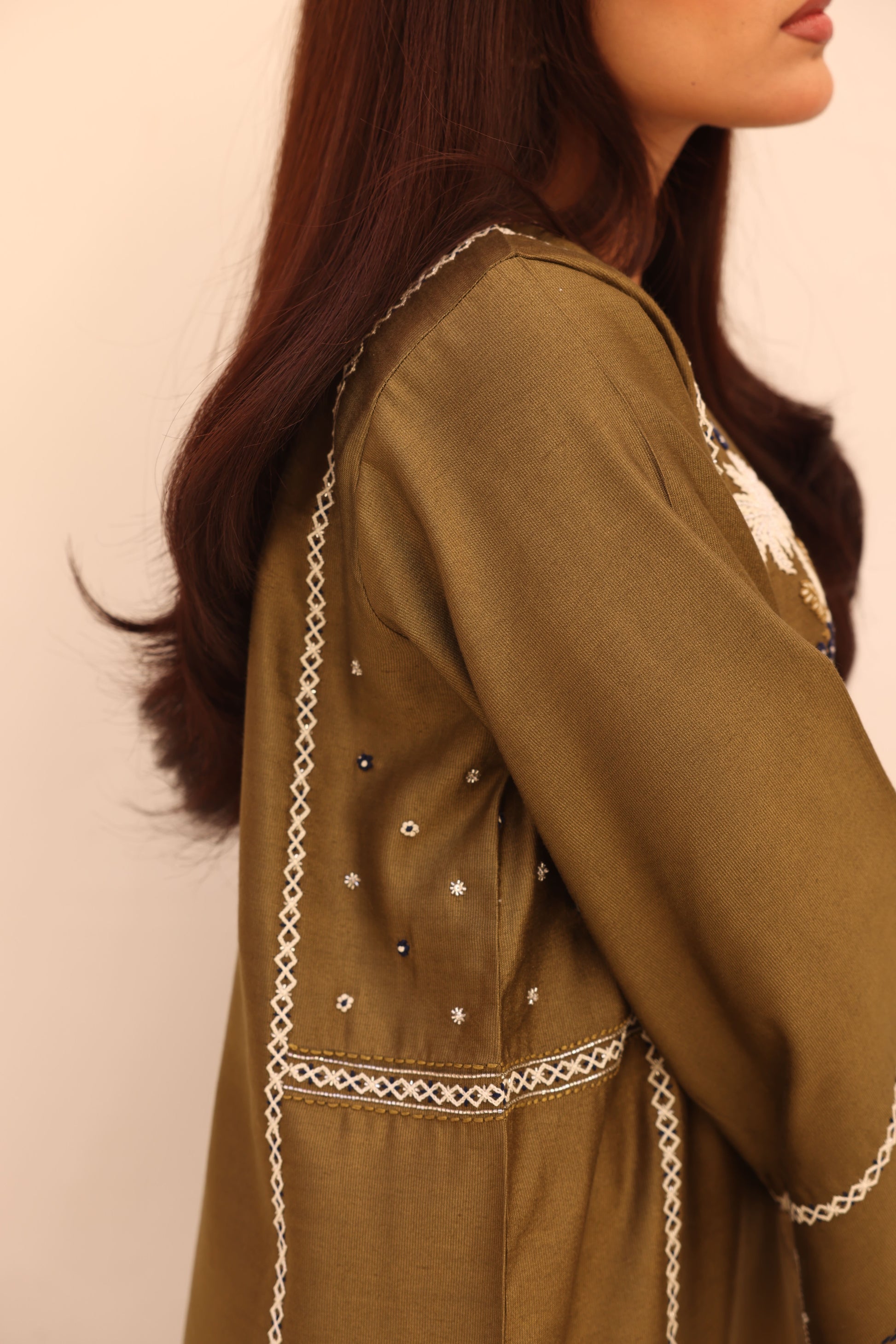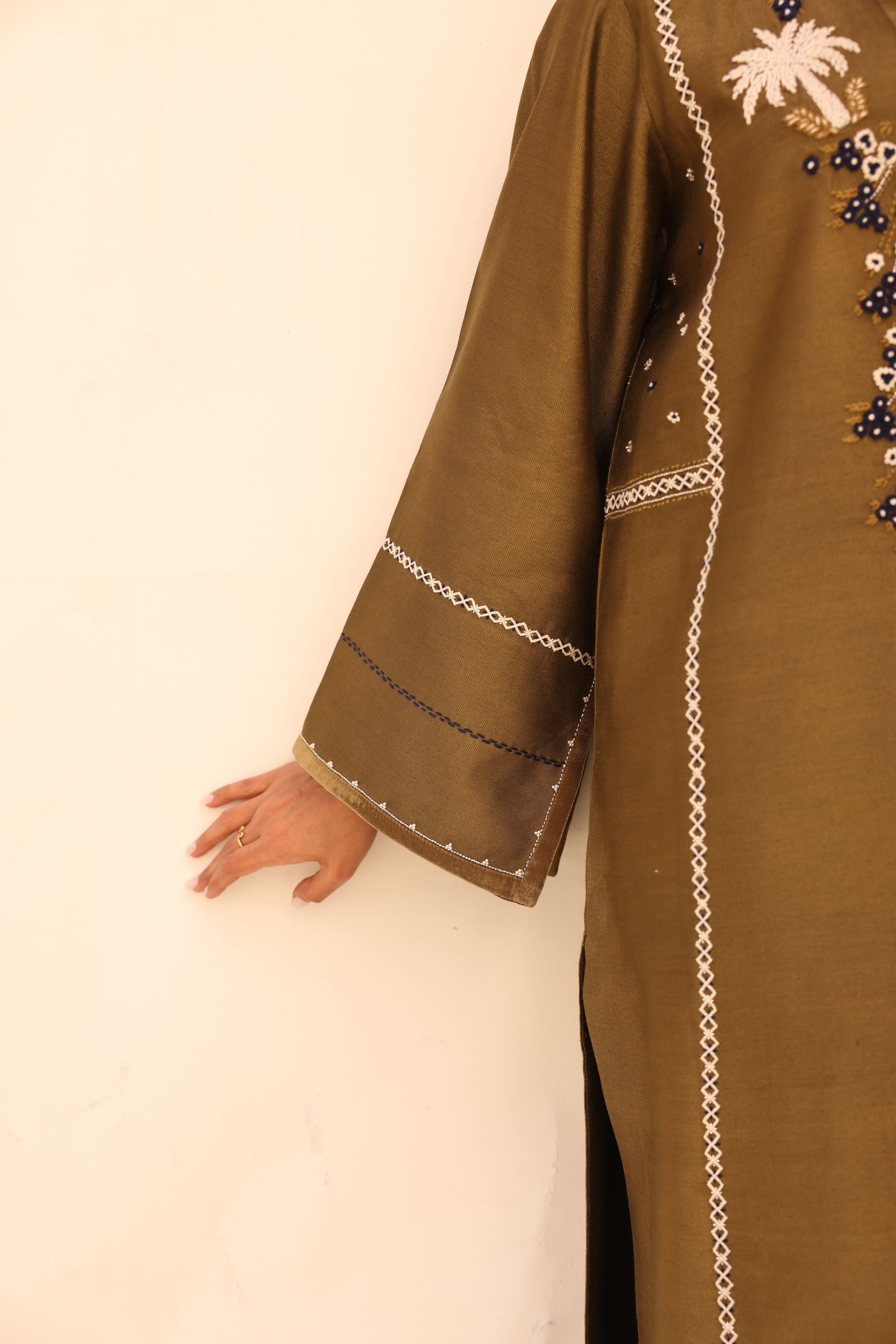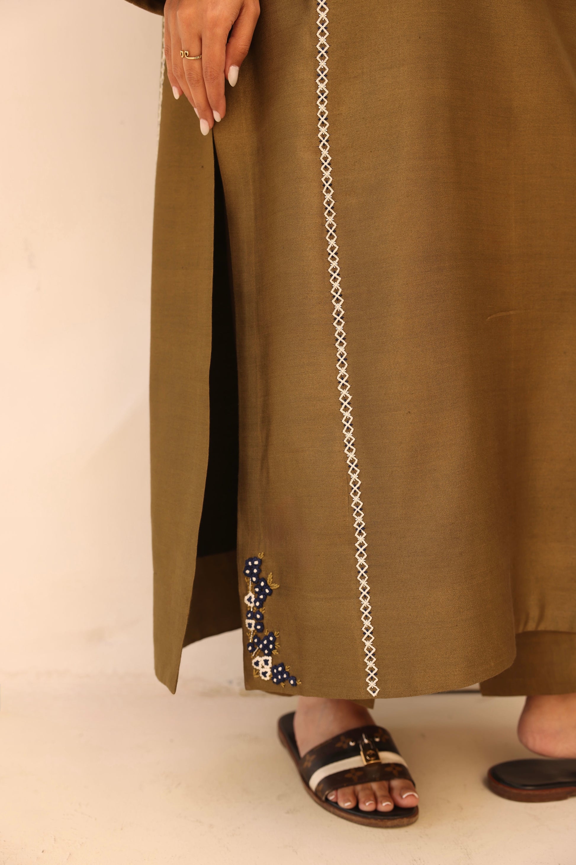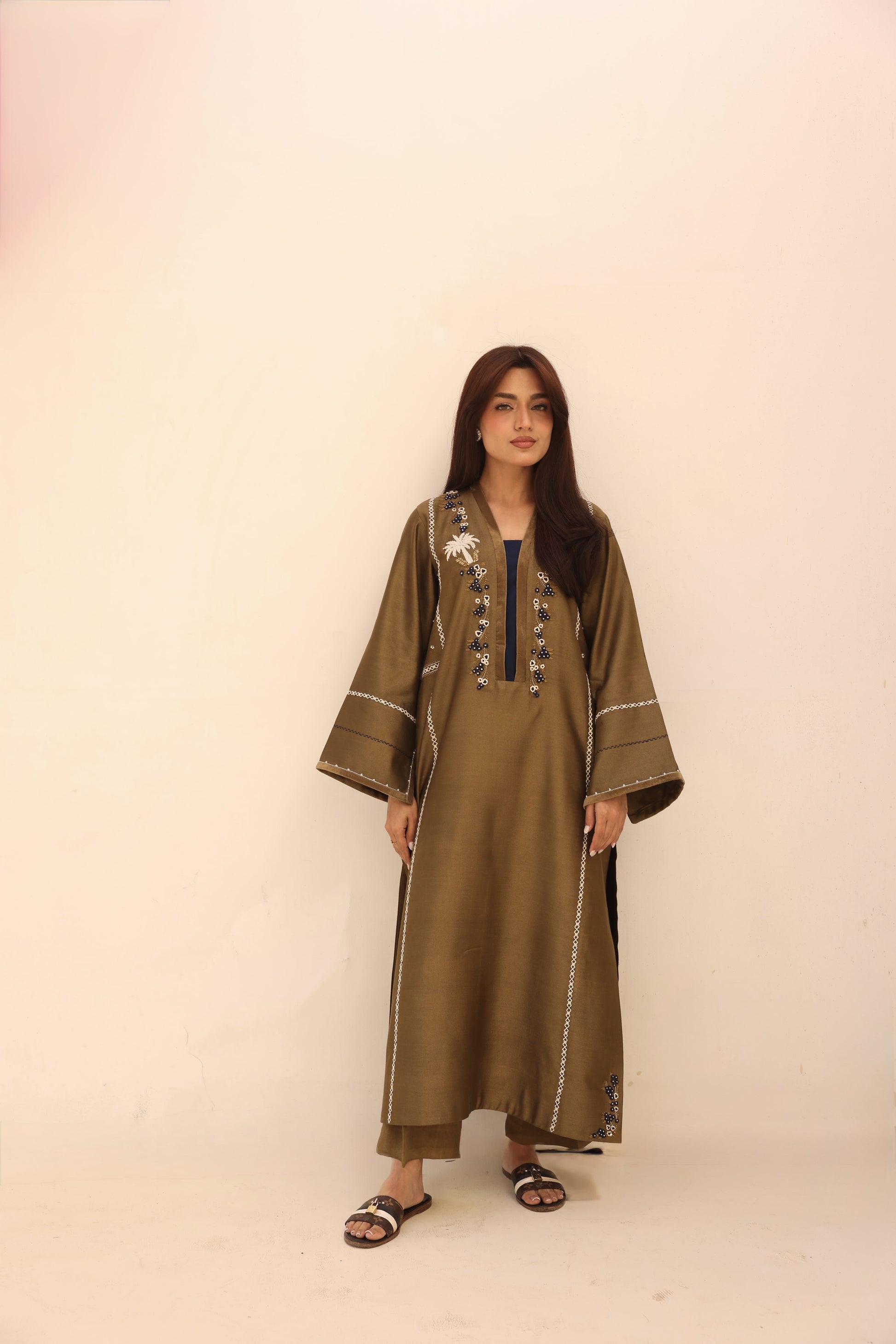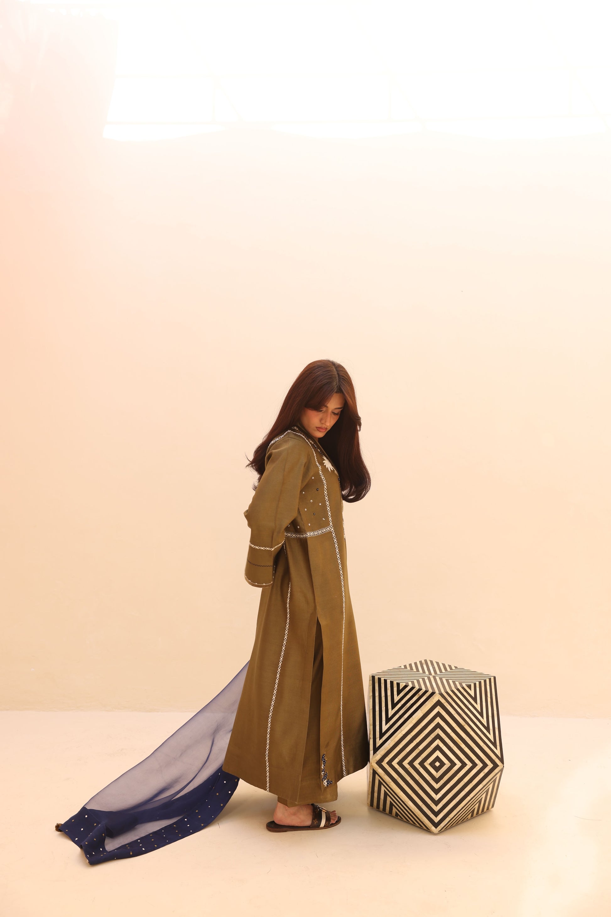 Sable is where earthy olive meets deep midnight blue, a pairing that feels rich, calm, and quietly bold. The kurta is traced with delicate hand embroidery that runs like soft lines of poetry across the fabric, while the navy dupatta drapes fluidly, dotted with subtle accents that catch the light as you move.