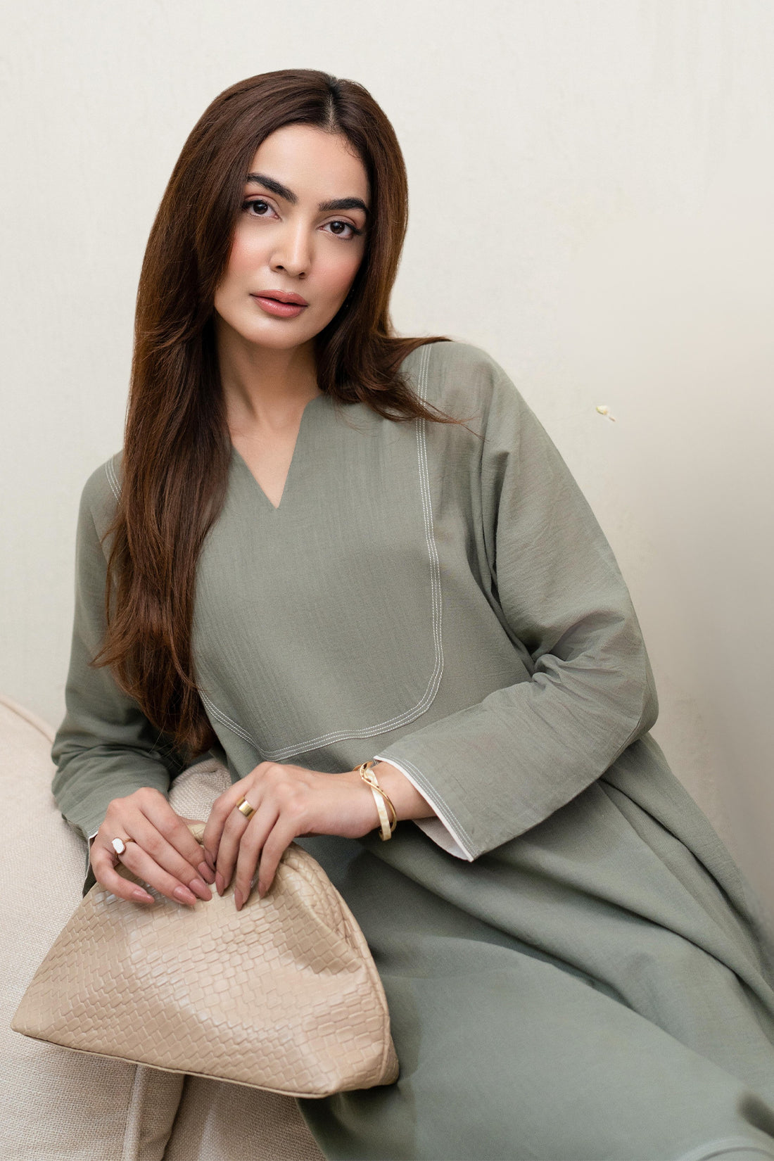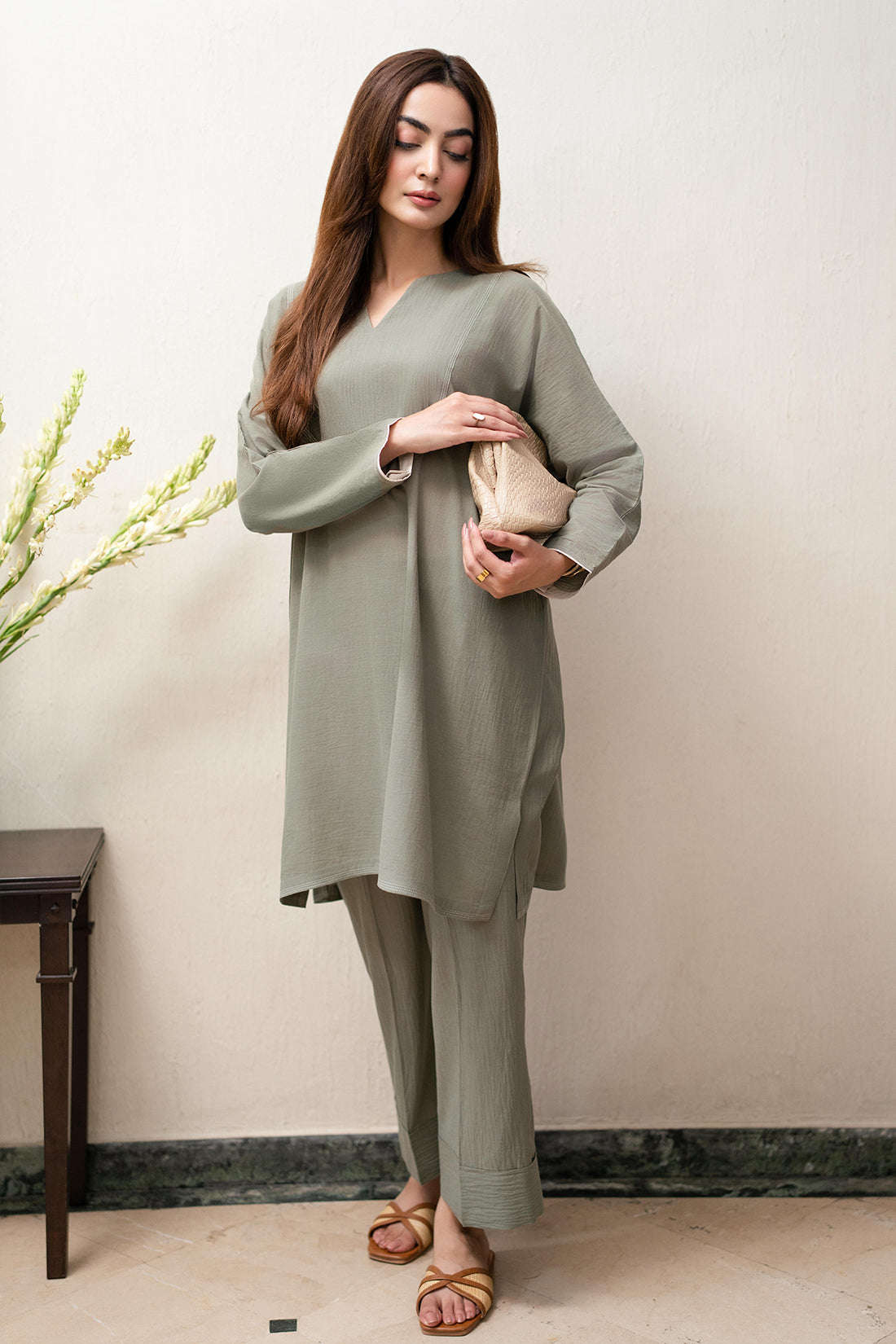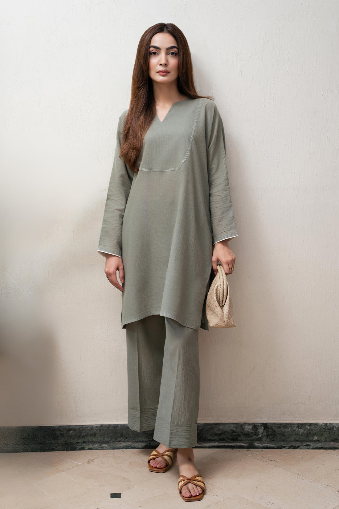 Cut from a soft, naturally wrinkled sage cotton fabric, this is all about ease. A clean, baggy-fit co-ord in muted sage. Designed with relaxed shoulders, a curved contrast stitch neckline, and culotte trousers for everyday ease. Minimal yet polished, this set is made to take you from quiet mornings to unhurried evenings; effortless, season after season.