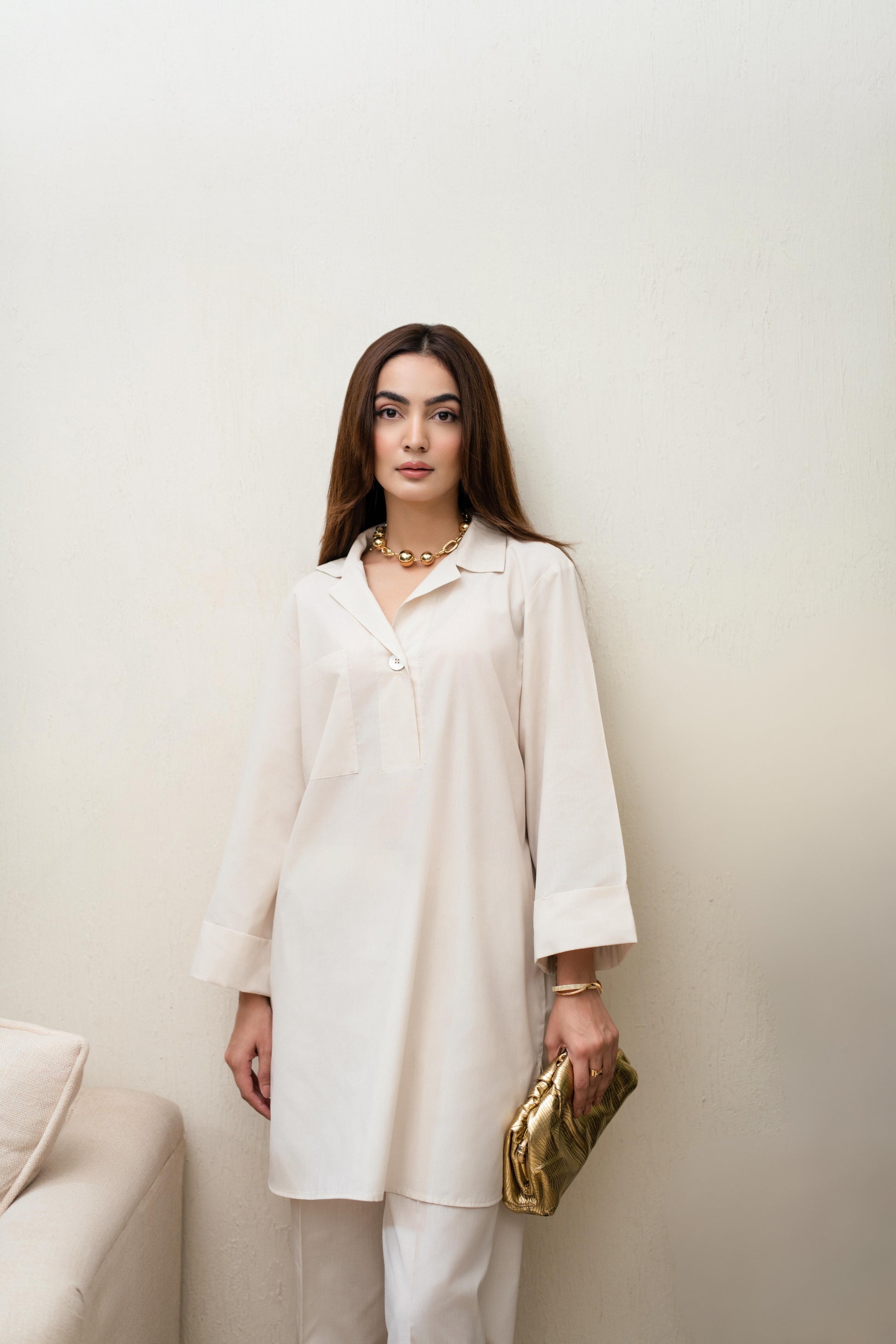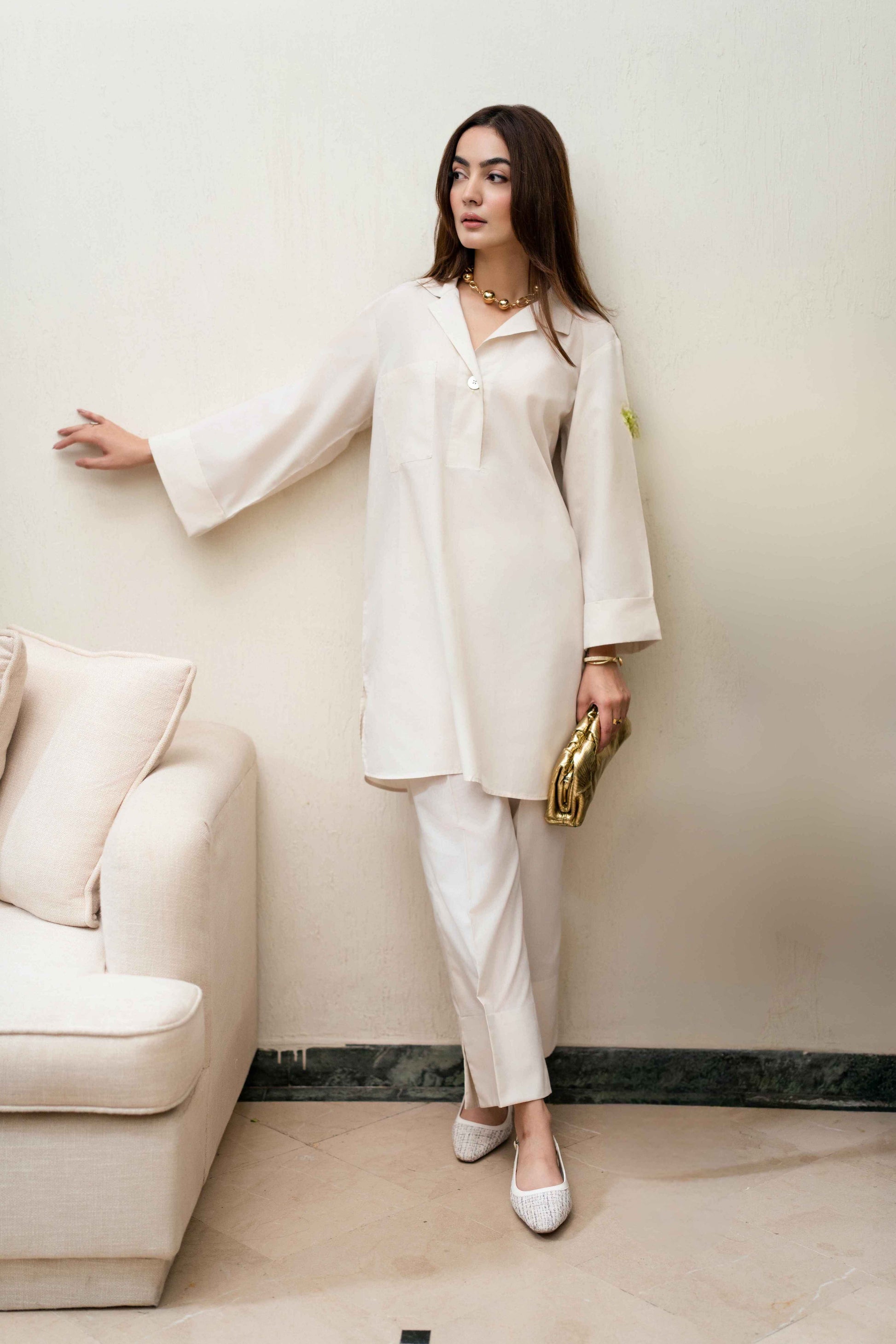 Crafted in blended poplin cotton, this white co-ord is all about lightness and ease. The shirt features a sharp collar neckline with a clean, straight cut that skims effortlessly, minimal but elevated. Paired with easy trousers, it’s crisp, airy, and breathable, making it your go-to for coming days. A timeless white, reimagined with modern simplicity.