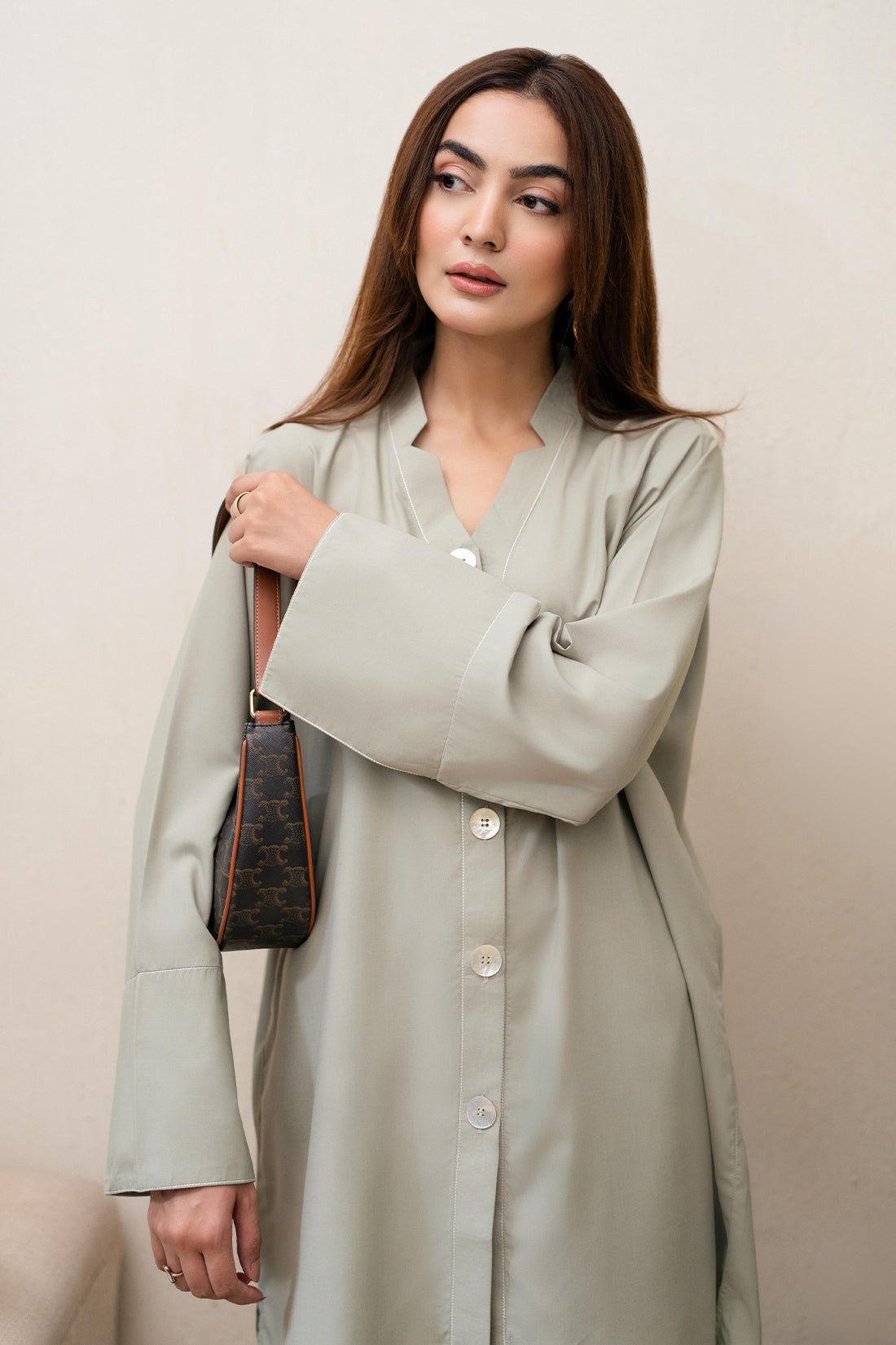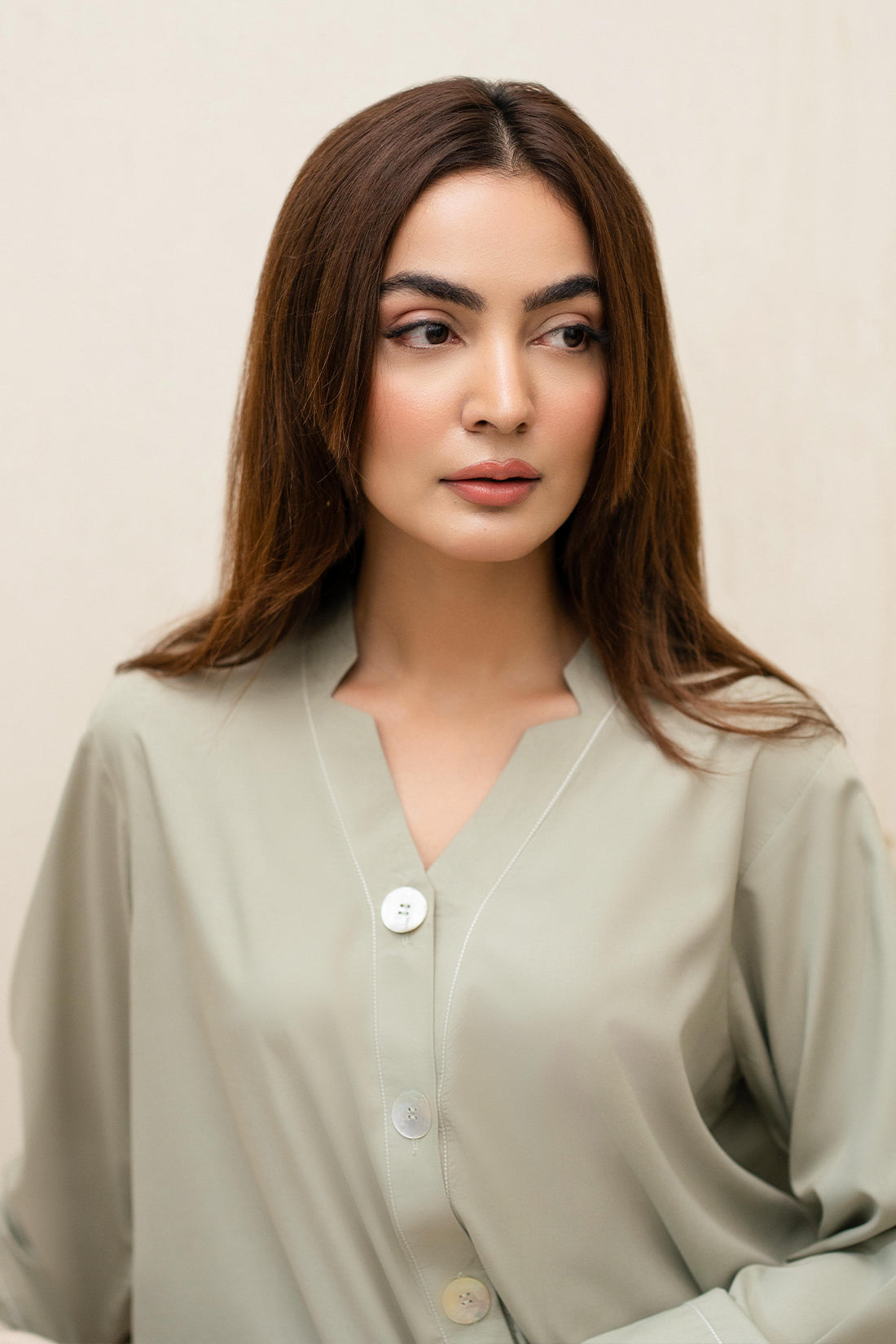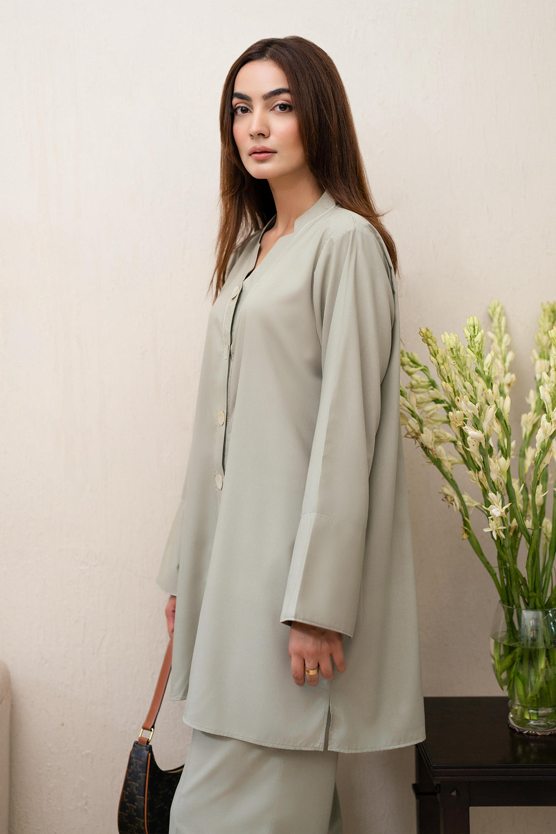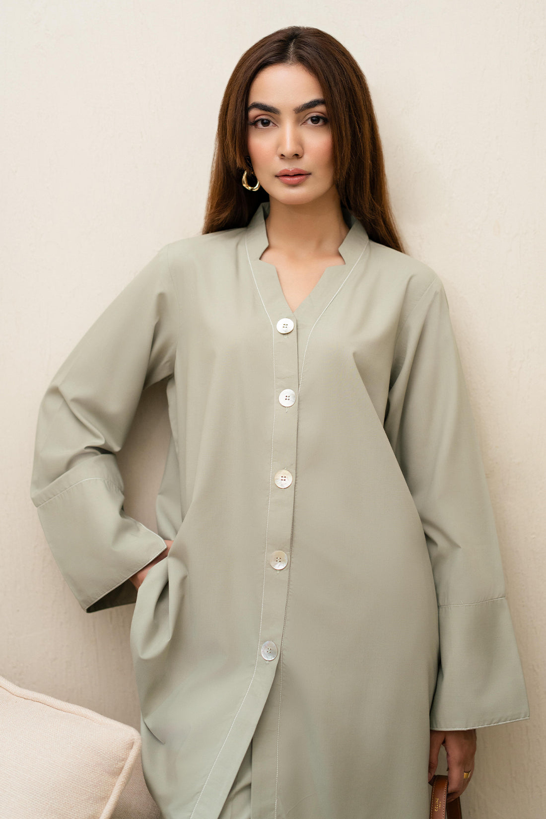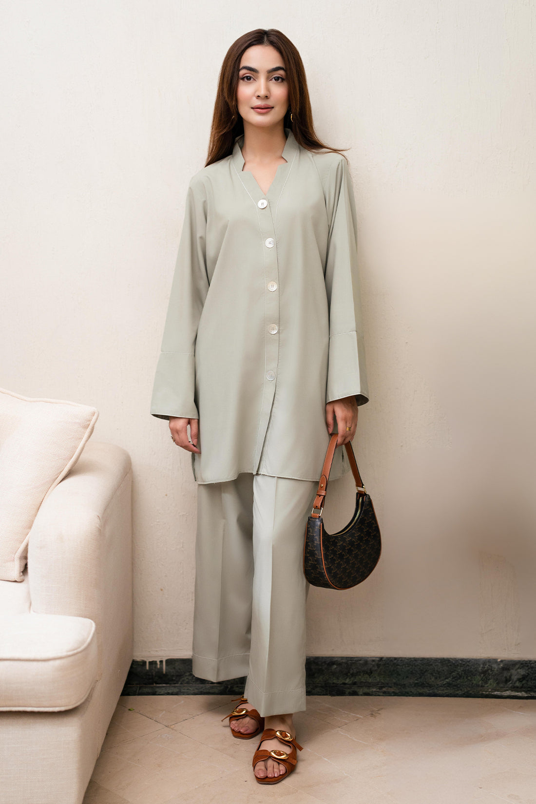 Soft mint, cut in a fine cotton blend for a clean, breathable finish. The shirt features a straight silhouette with cuff sleeves, a sharp neckline, and a full mother of pearl button-down front for modern ease. Side pockets on the long straight pants complete the look. Effortless, functional, and fresh.