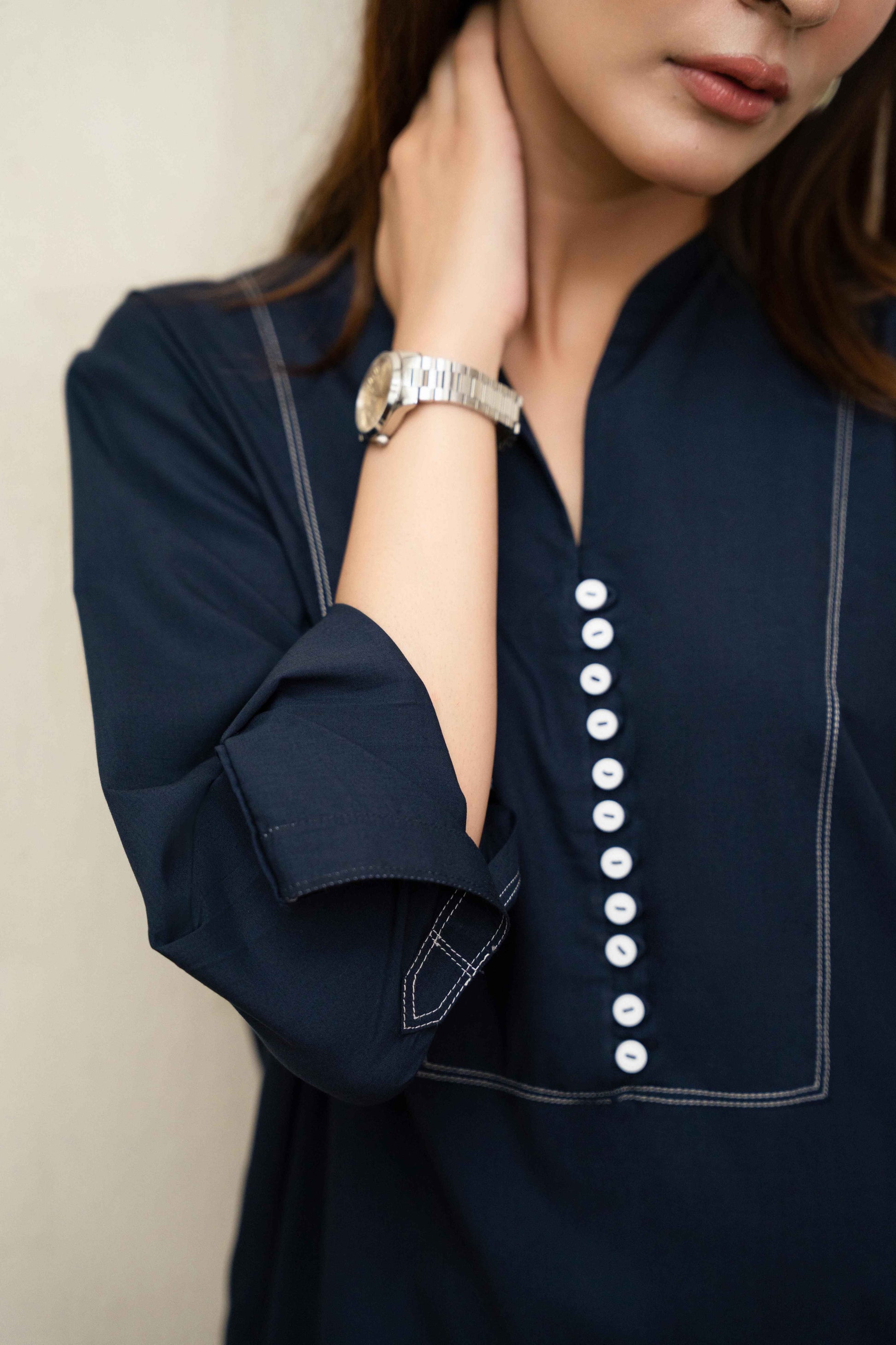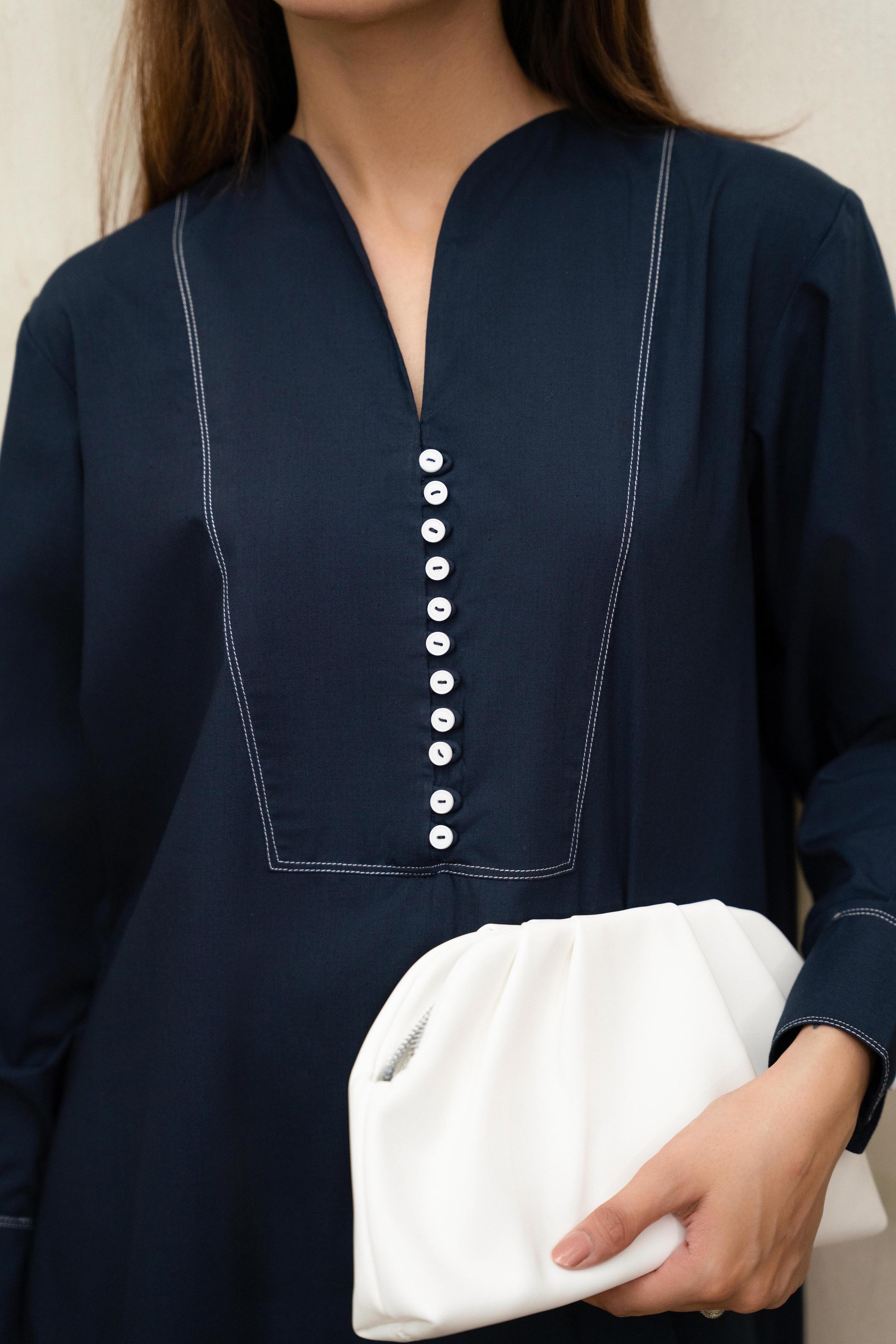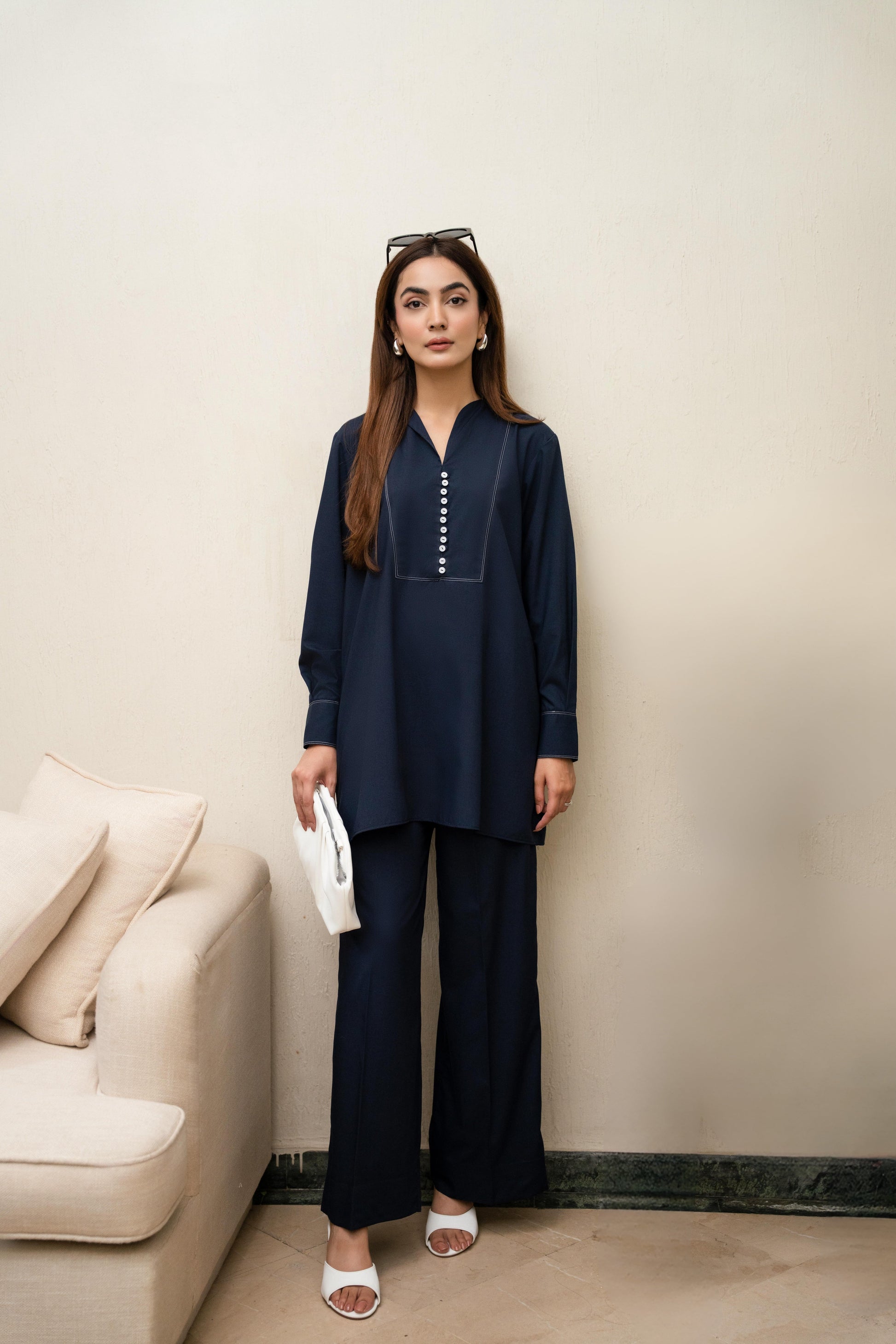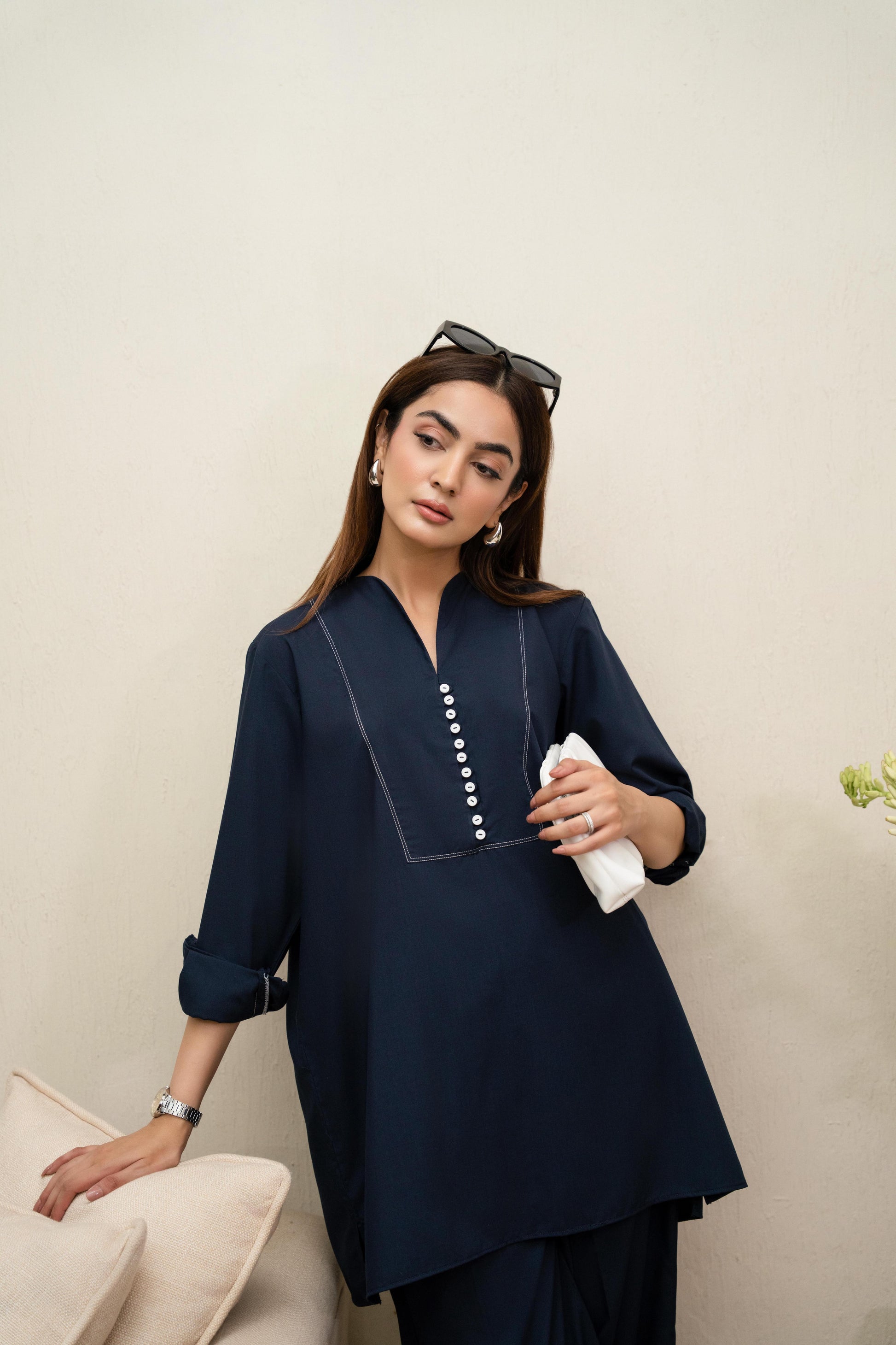 Navy done the right way. Made in a fine cotton blend, this co-ord keeps it sharp yet easy. The shirt has cuff sleeves and a V-slit neckline, finished with a line of contrast buttons that add just the right detail. Paired with long, wide-leg trousers, it’s the kind of solid that looks polished without ever trying too hard.