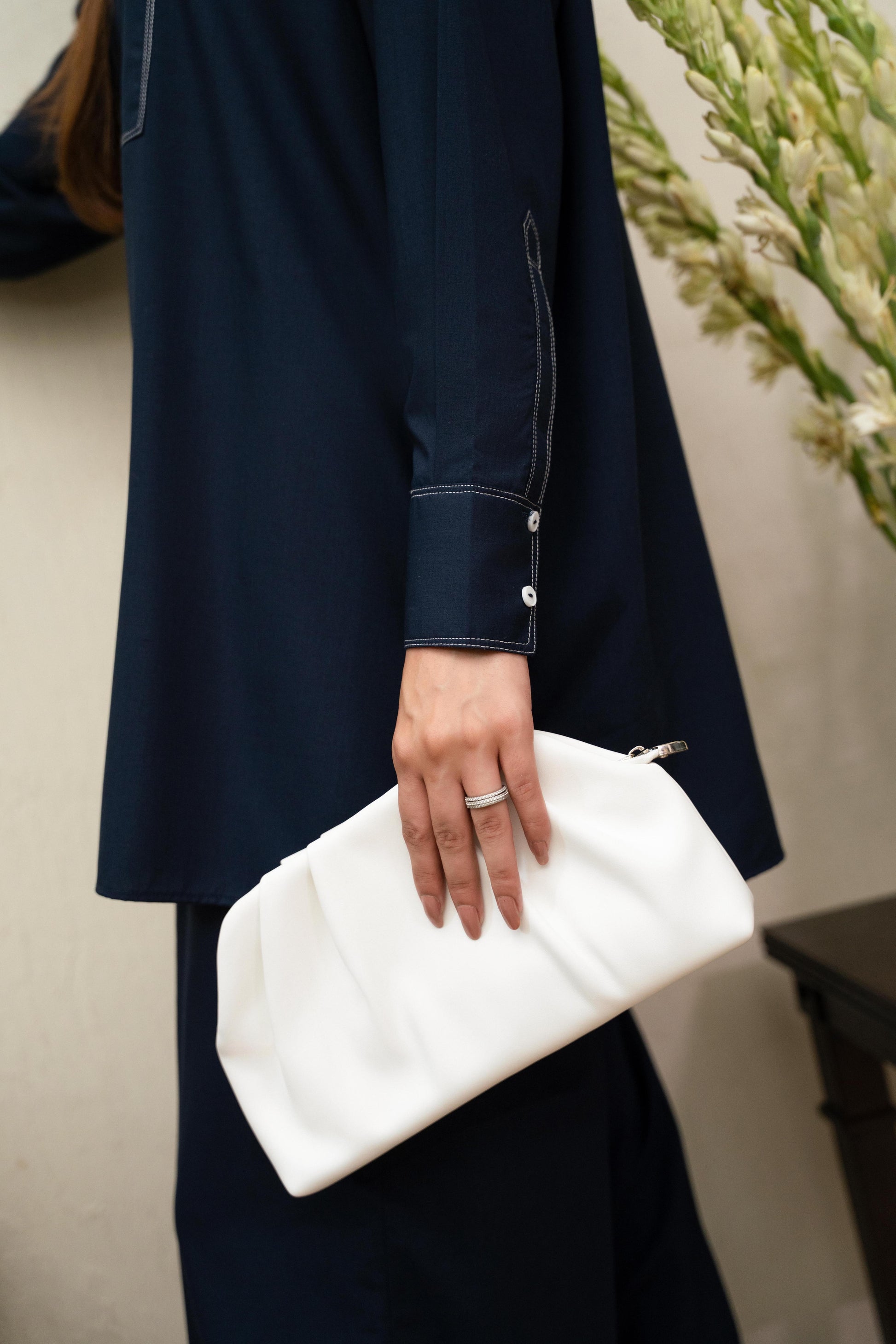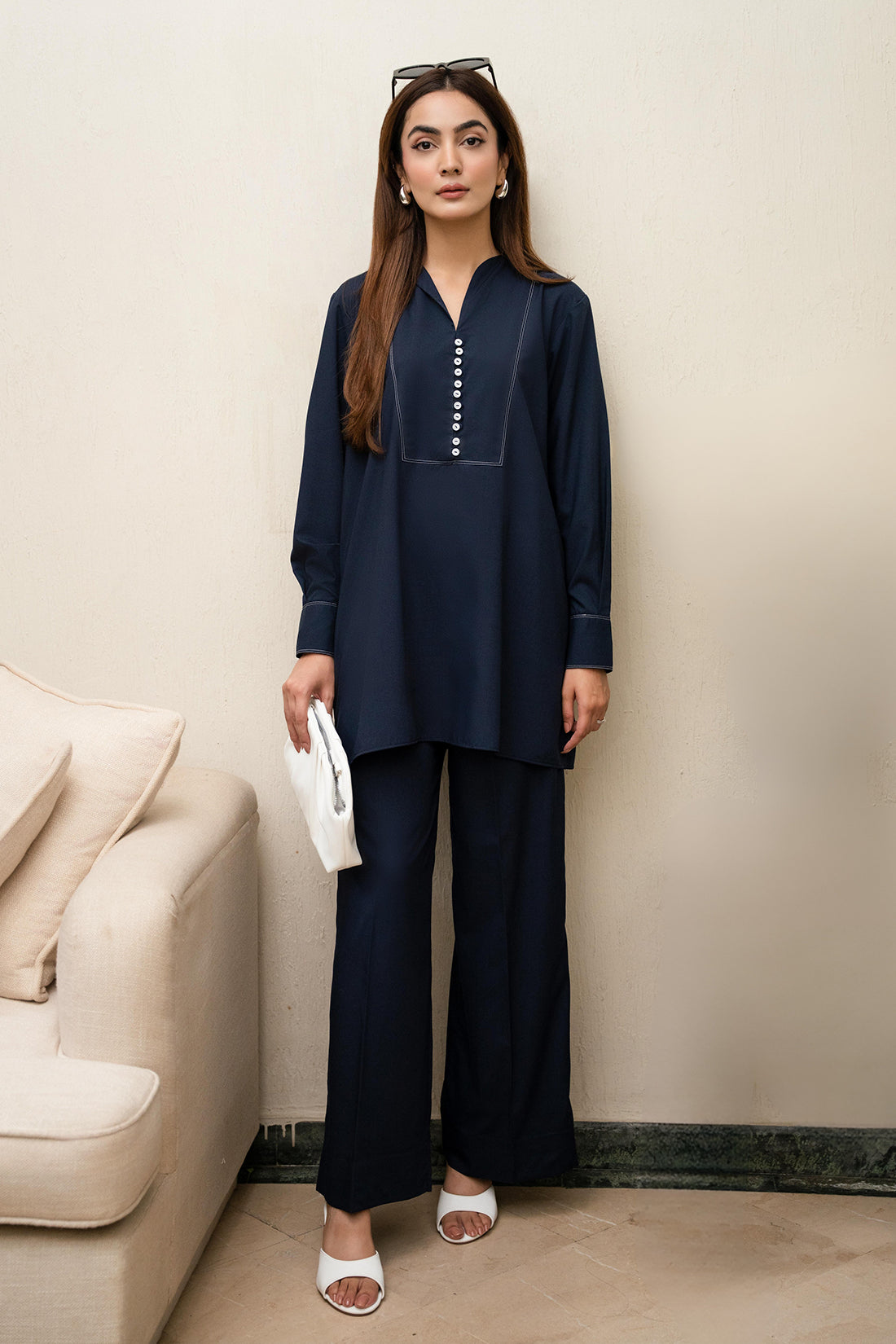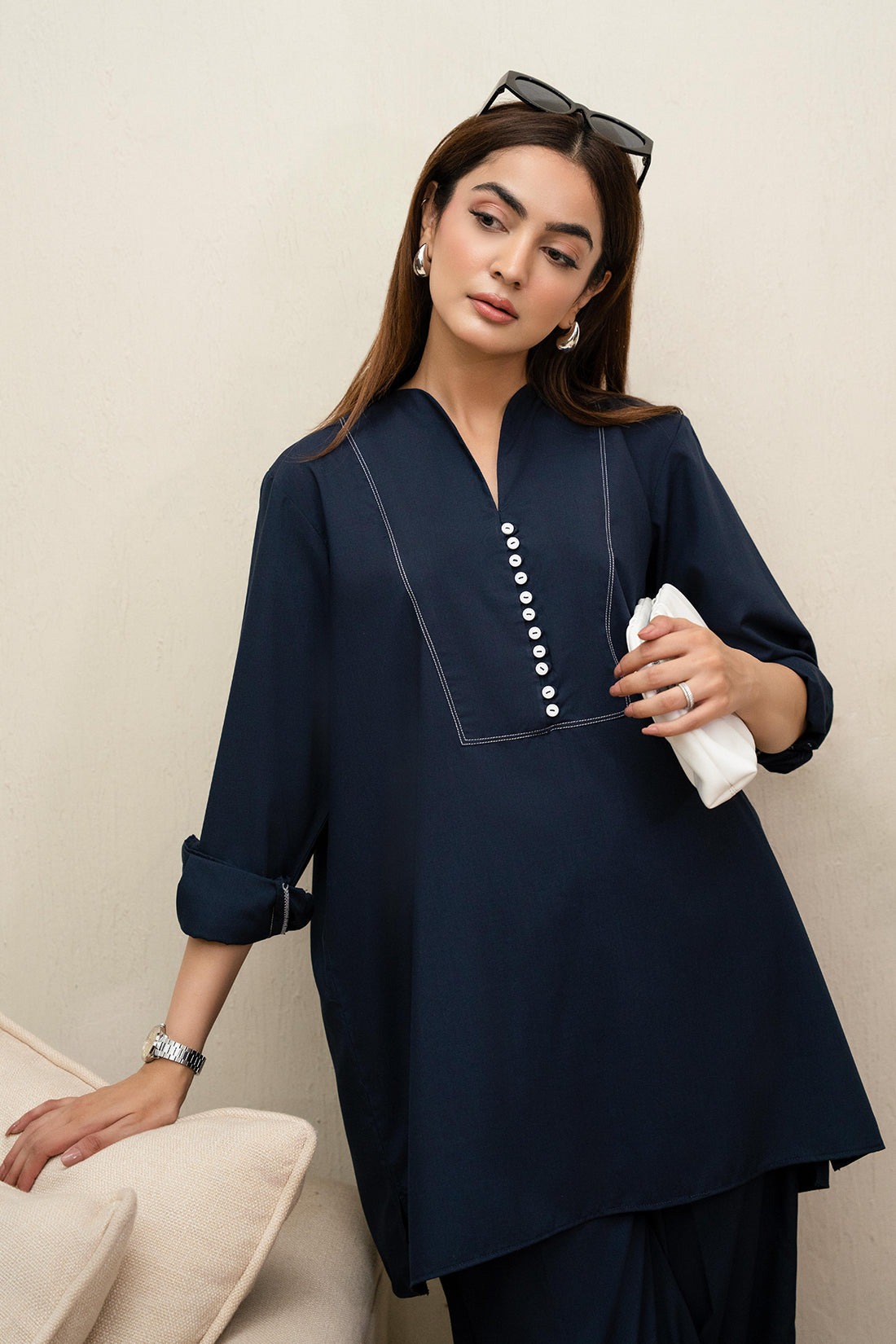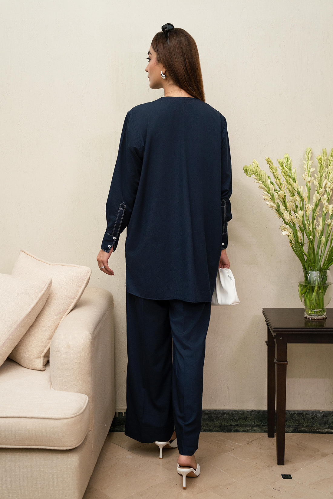 Navy done the right way. Made in a fine cotton blend, this co-ord keeps it sharp yet easy. The shirt has cuff sleeves and a V-slit neckline, finished with a line of contrast buttons that add just the right detail. Paired with long, wide-leg trousers, it’s the kind of solid that looks polished without ever trying too hard.