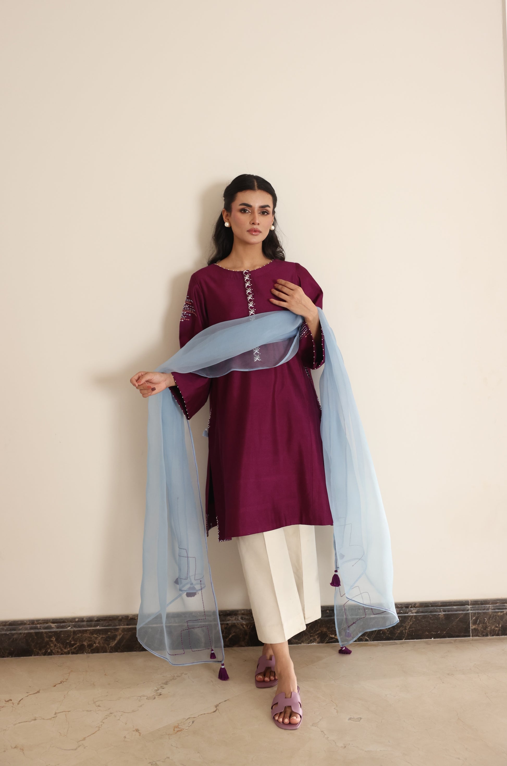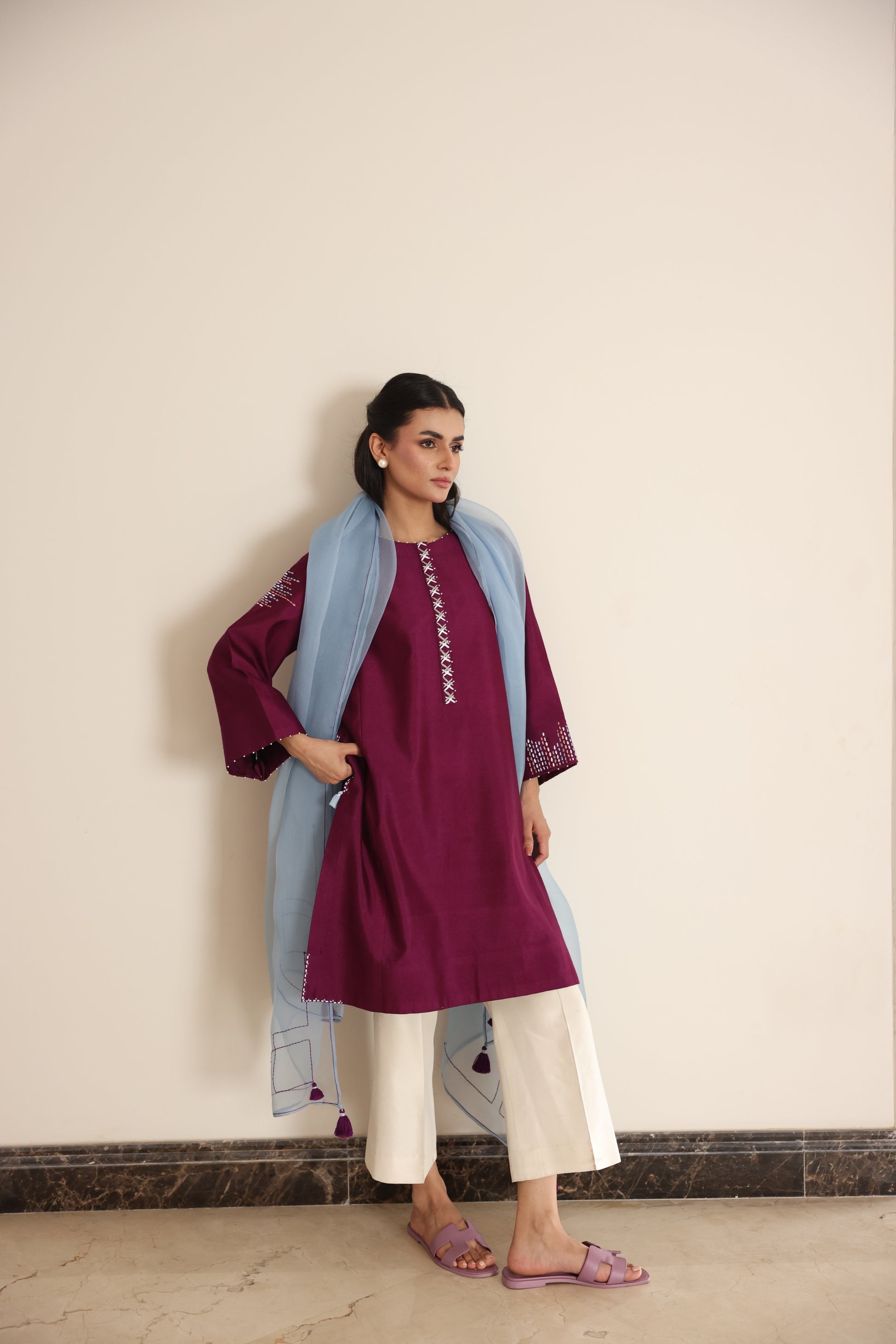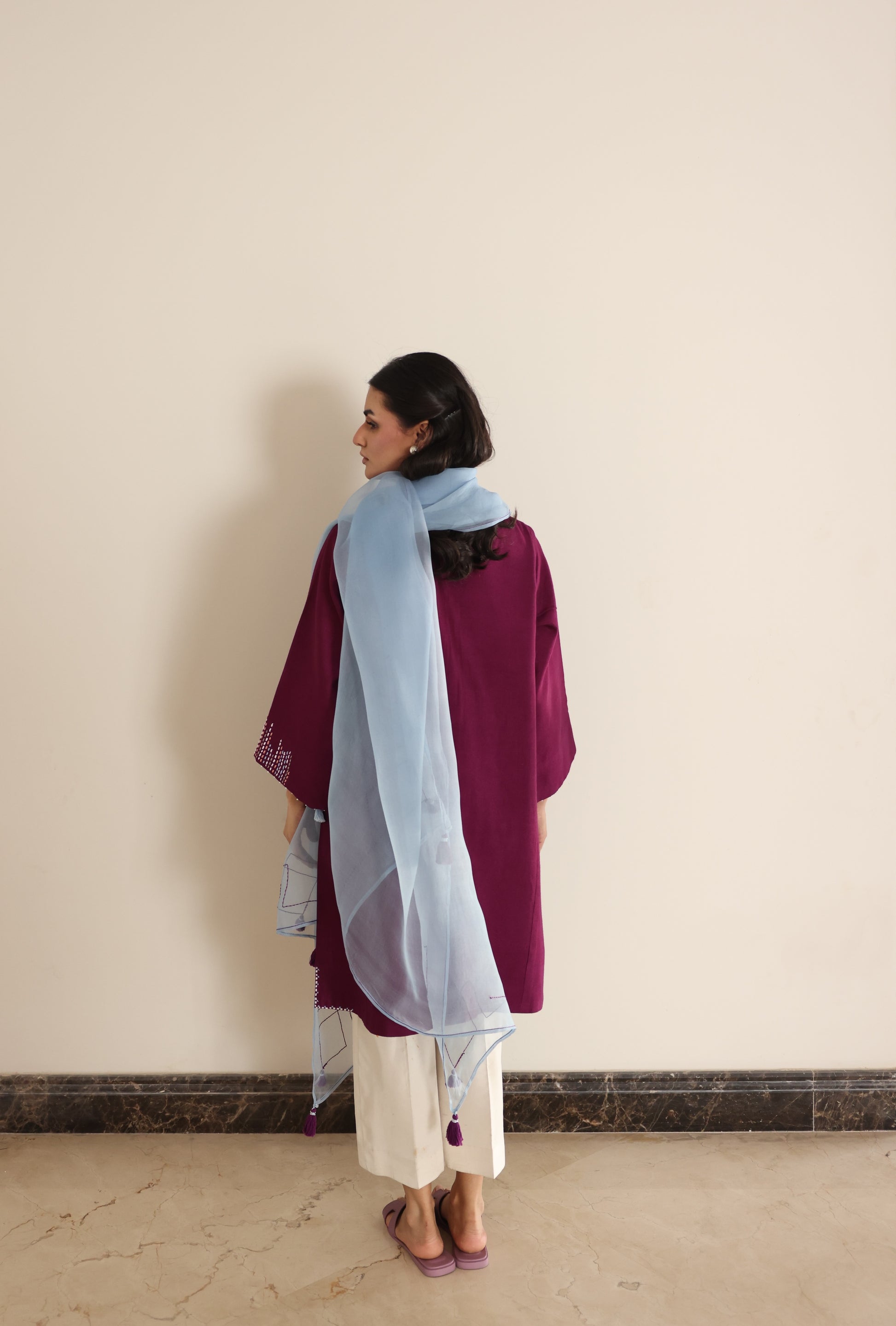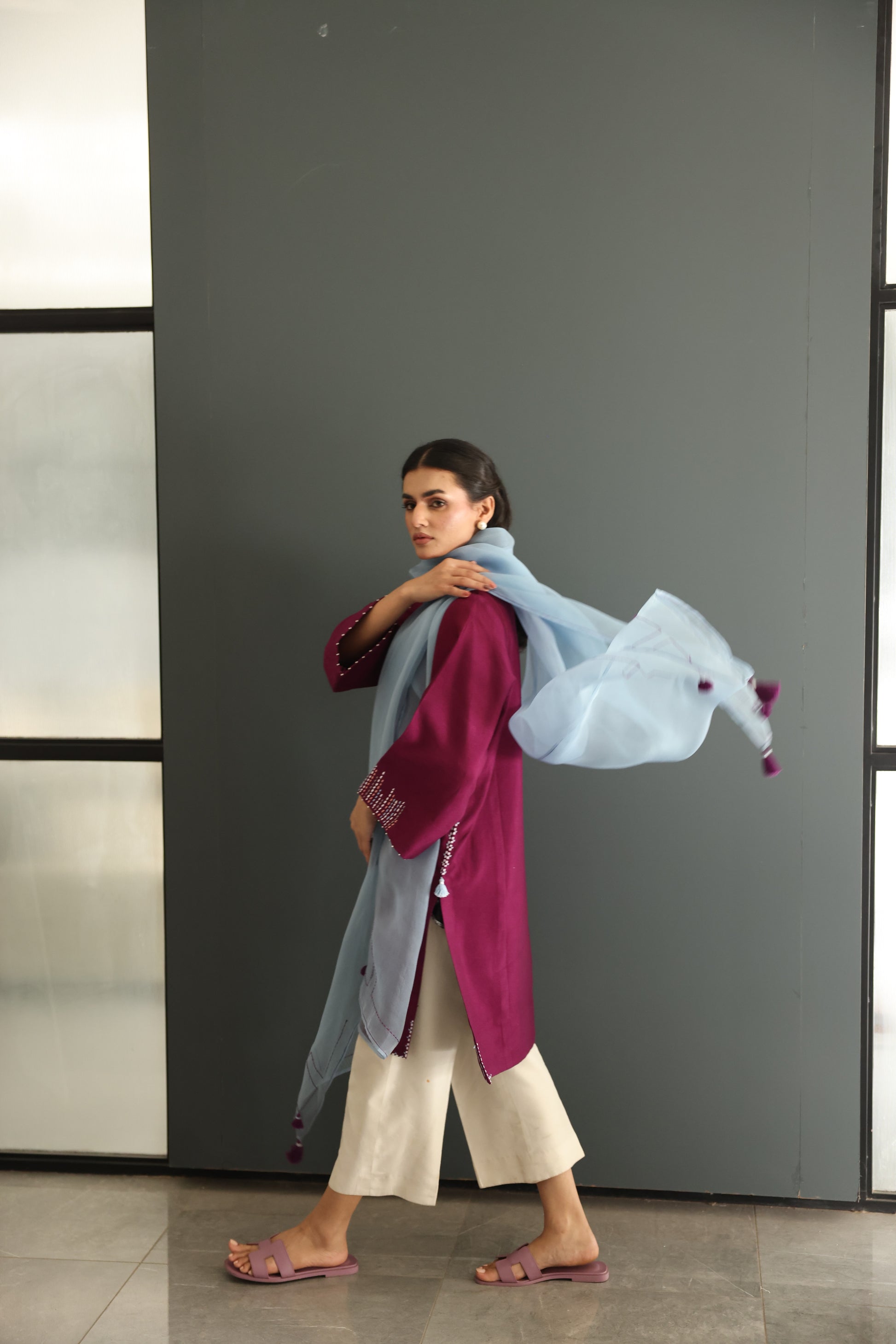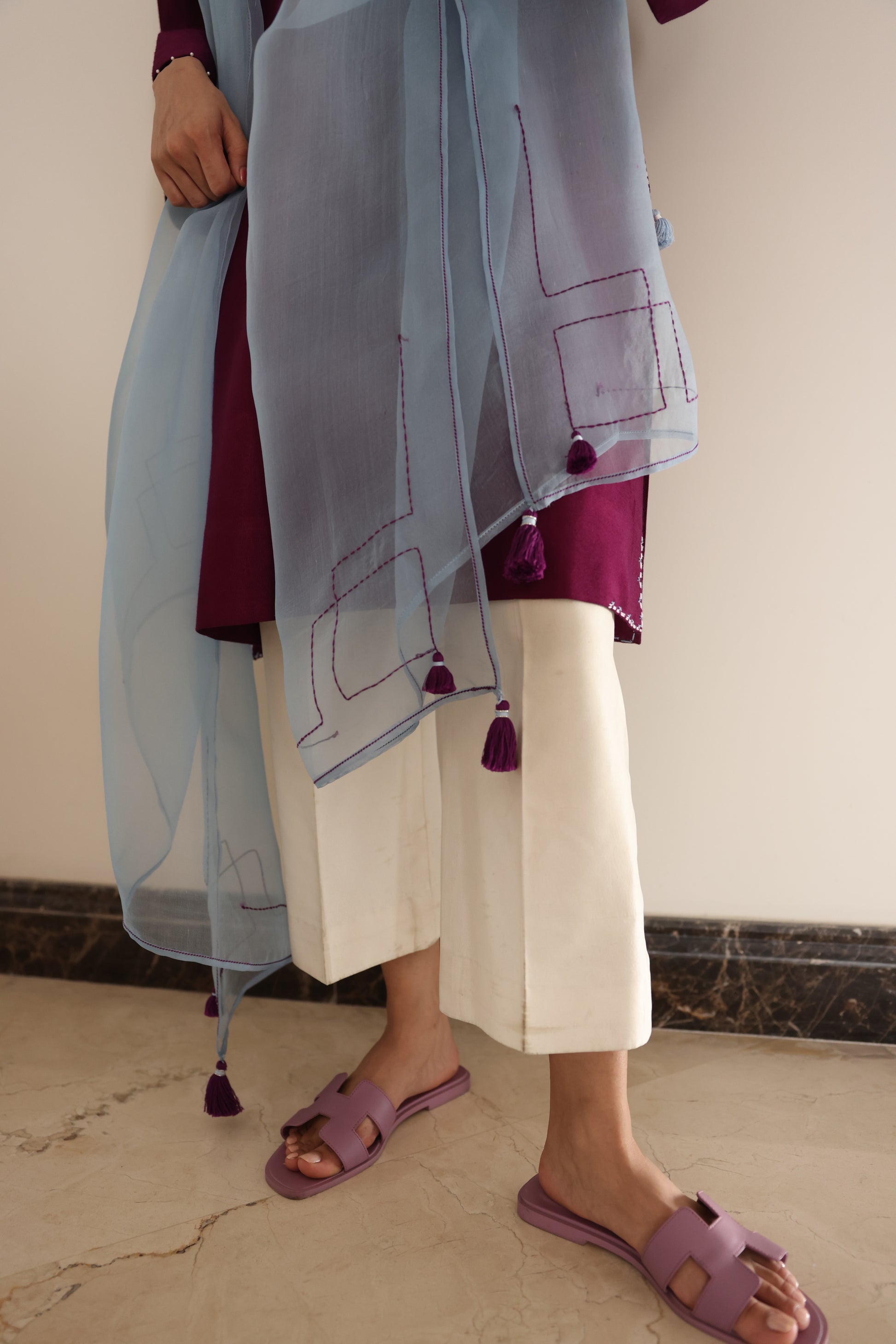 A symphony of subtle details, the Zimar Kurta set is made from deep aubergine cotton net with a soft feel. This kurta features intricate hand embroidery in accents of contrasting grey and blue. The dupatta mirrors this artistry with its embroidered pattern and our dangling signature tassels, while plain culottes complete the ensemble with effortless grace.