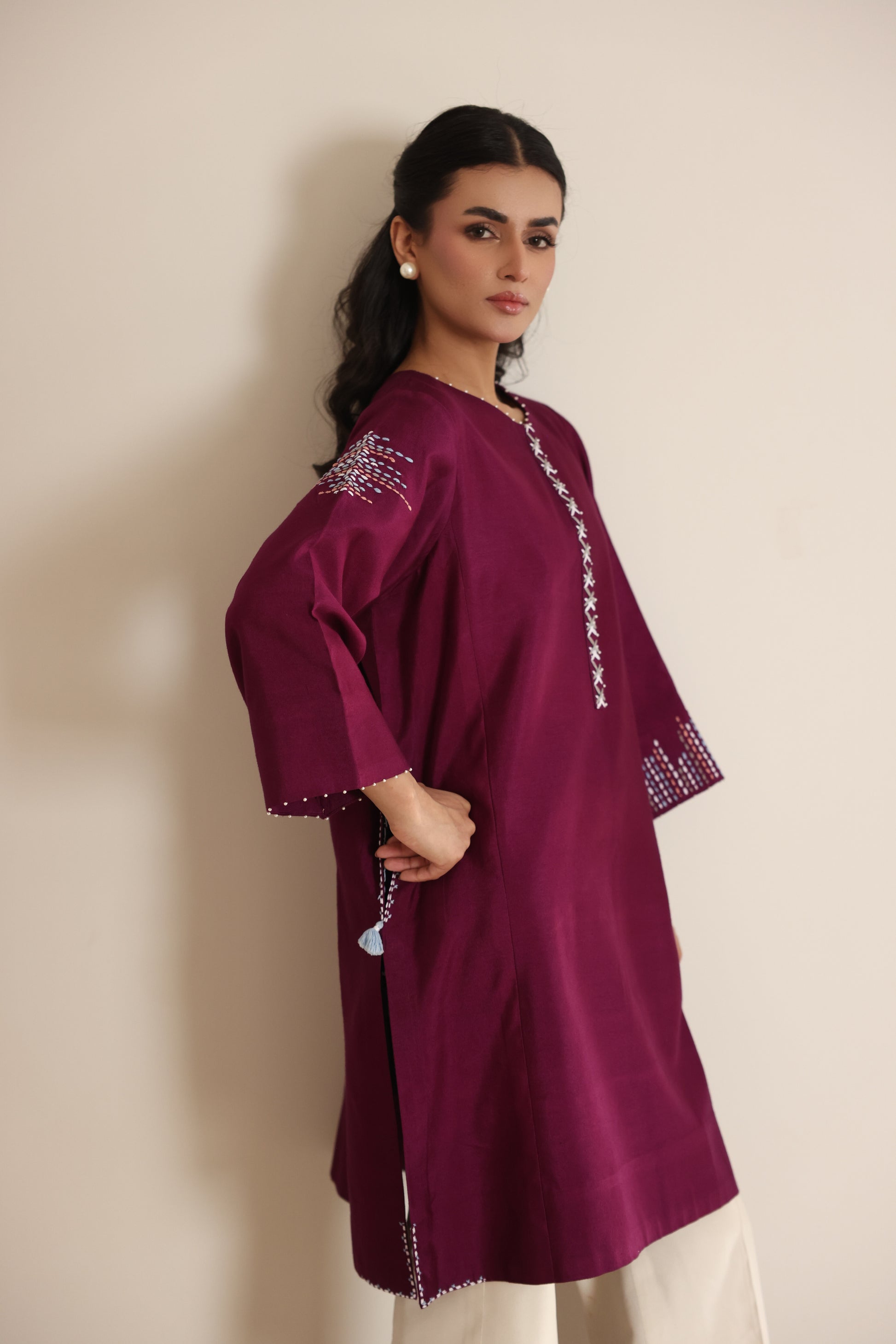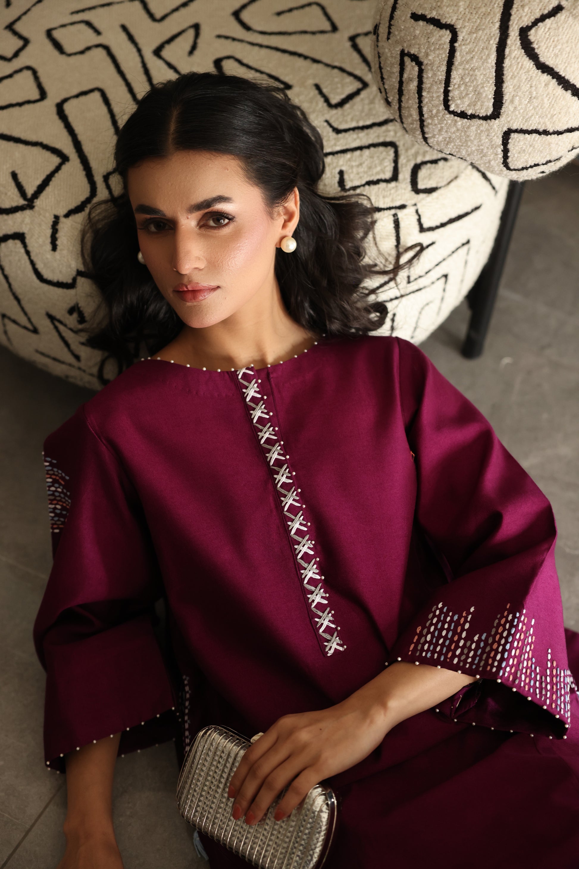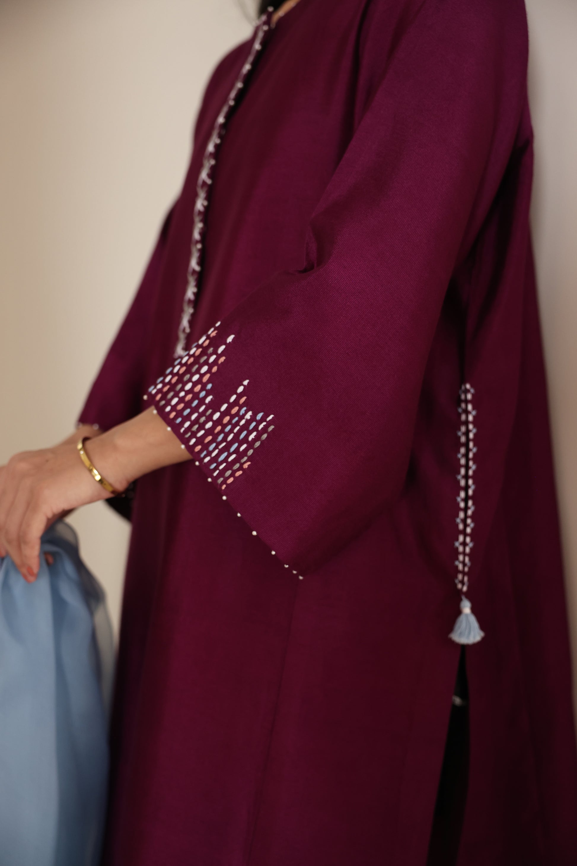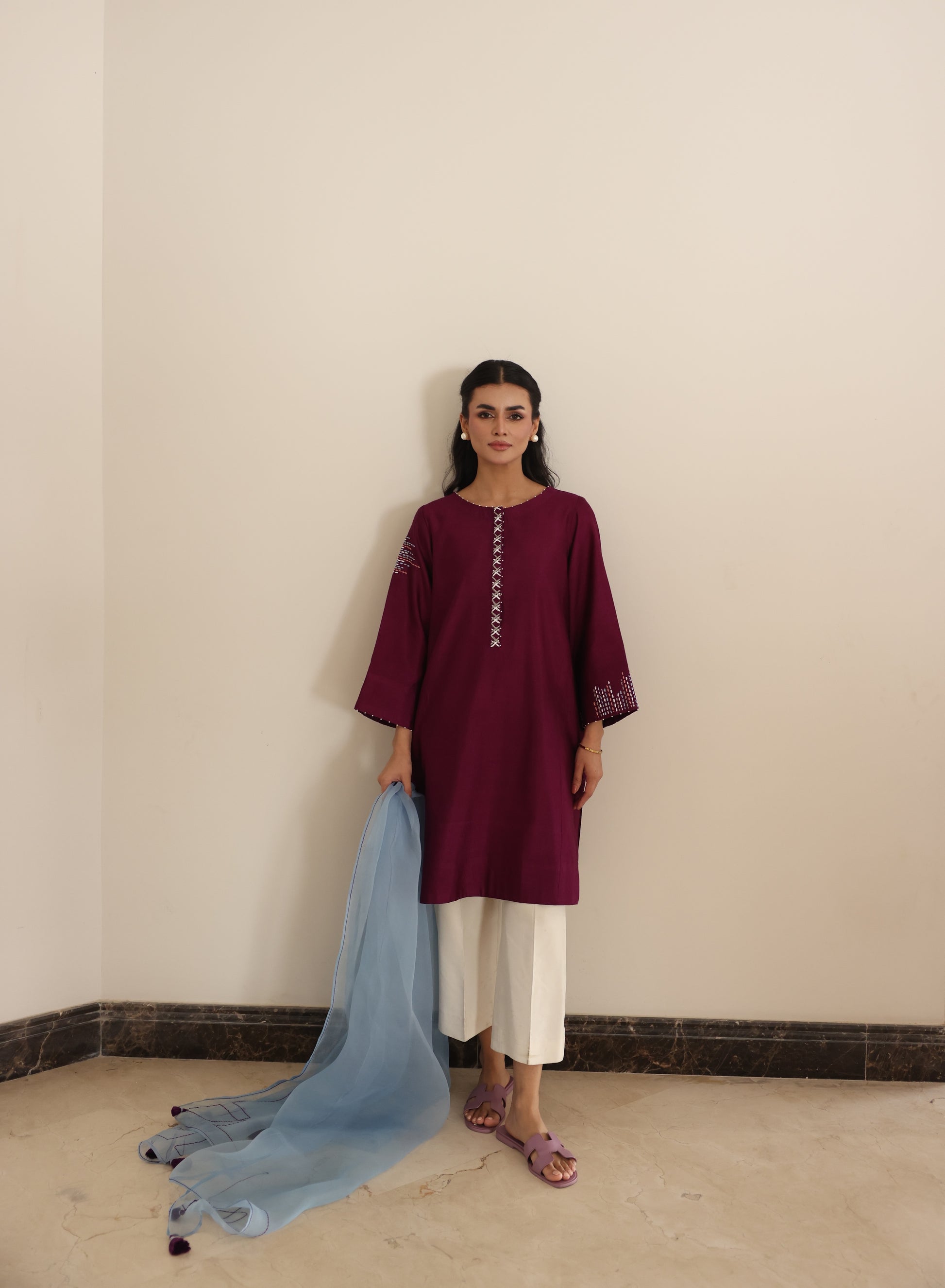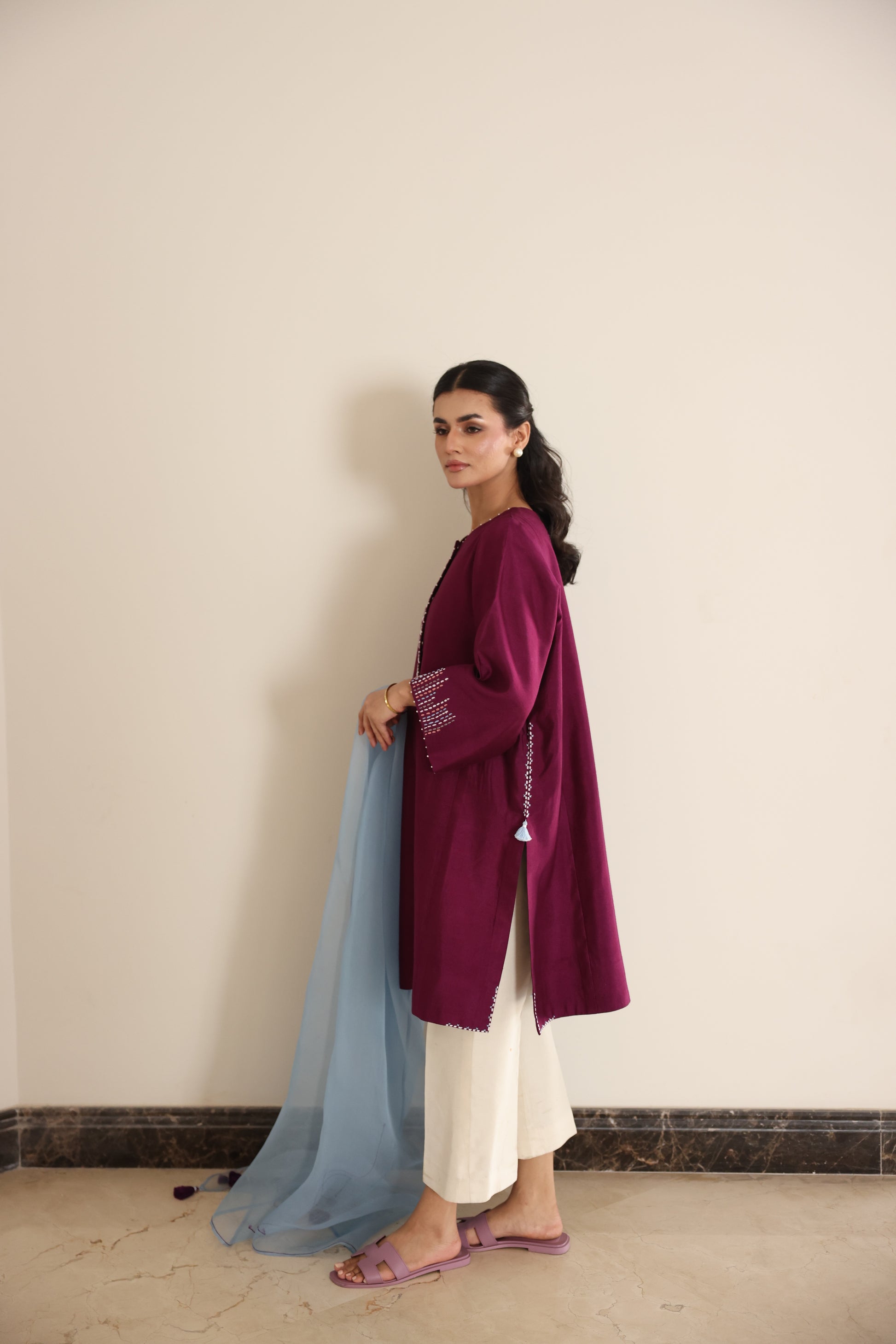 A symphony of subtle details, the Zimar Kurta set is made from deep aubergine cotton net with a soft feel. This kurta features intricate hand embroidery in accents of contrasting grey and blue. The dupatta mirrors this artistry with its embroidered pattern and our dangling signature tassels, while plain culottes complete the ensemble with effortless grace.